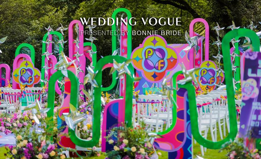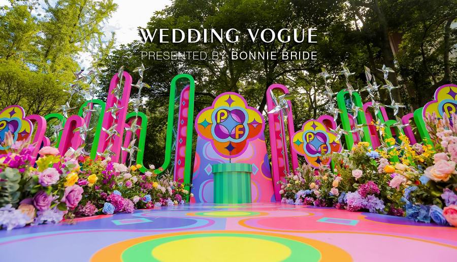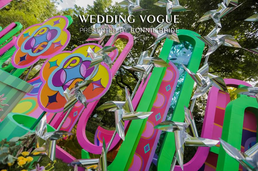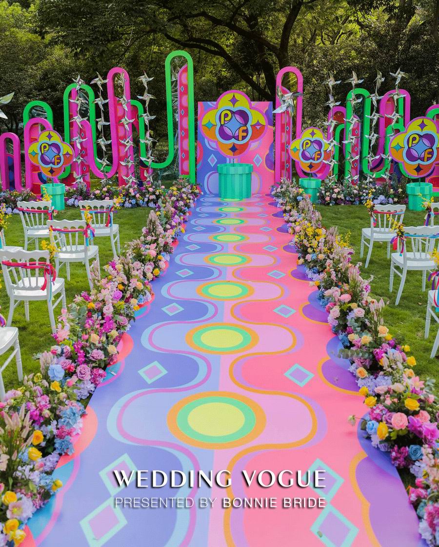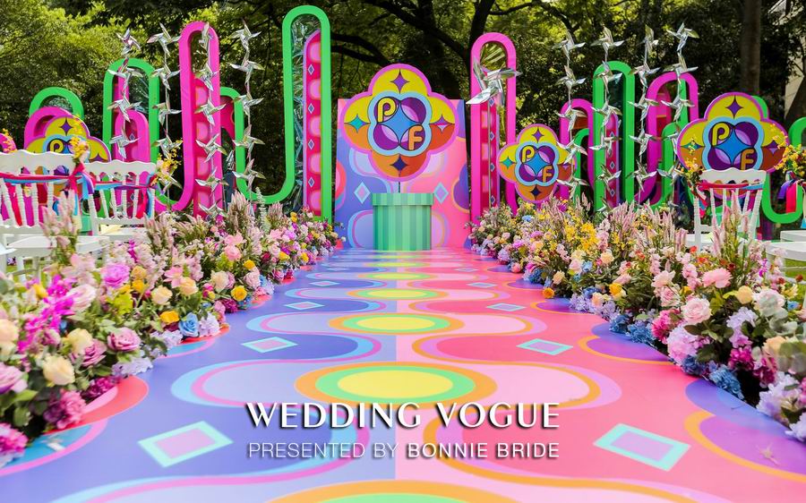 仪式区的T台设计取自经典单机游戏《块魂》中宇宙之王的国王造型,缤纷色彩的T台像似一条灿烂的彩虹之路。在遇见对方之后,潘潘和芳芳都不再是孤单的PLAYER ONE,牵着彼此的手,是设计师寓意的共同走过属于他们的彩虹之路。