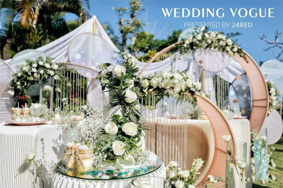 静谧的水面,广阔的视角,宝格丽酒店的水台给予了24RED设计师更加多角度的思维。“通透”成为了白天婚礼设计的重点。