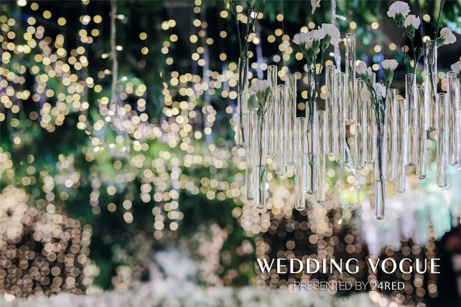 顶部垂吊用满吊的方式用星星灯去提亮,桌面则采用了长桌,细节处,名卡用了试管,将每位宾客的名字塞入透明的试管当中,菜单用透明亚克力设计与名卡做搭配。不论是白天的仪式还是夜晚的晚宴,澄净、通透都是其最为显著的重点。