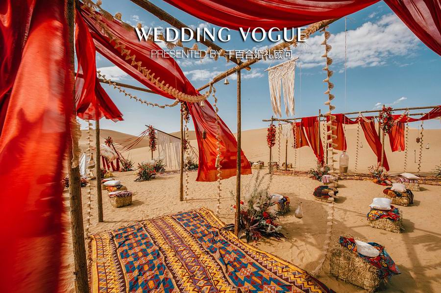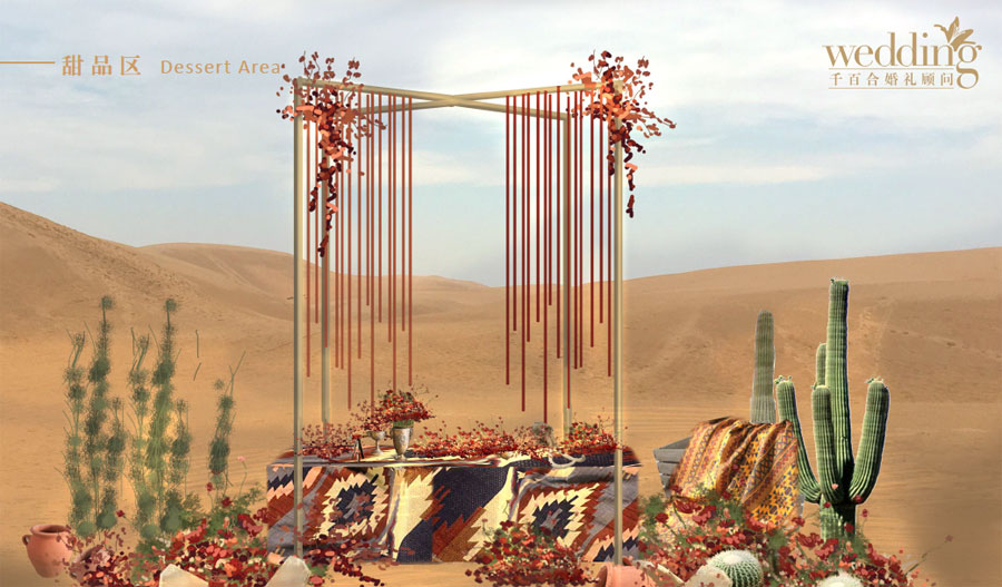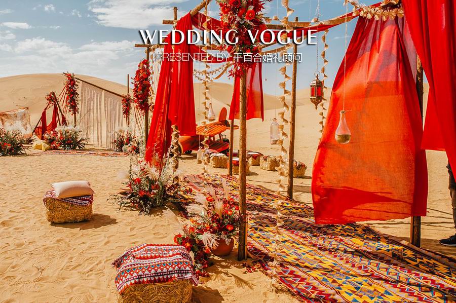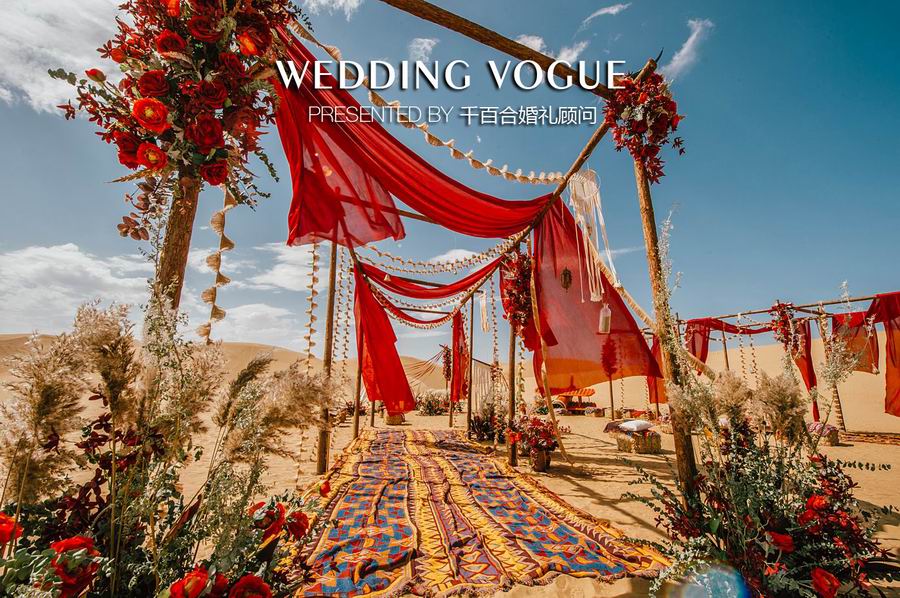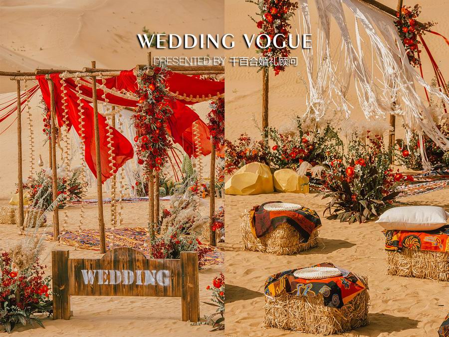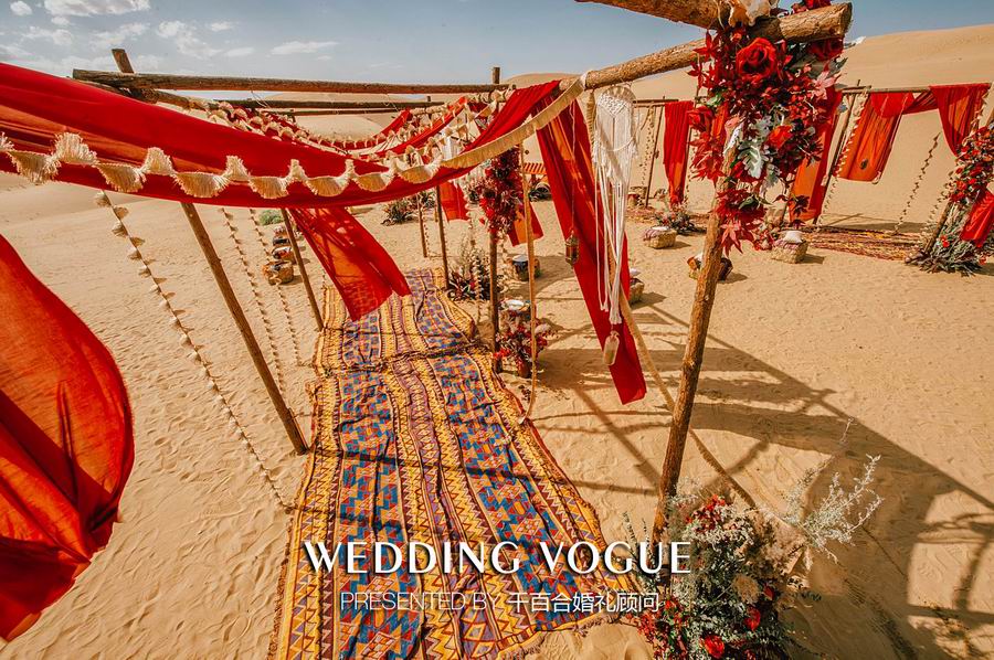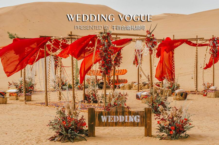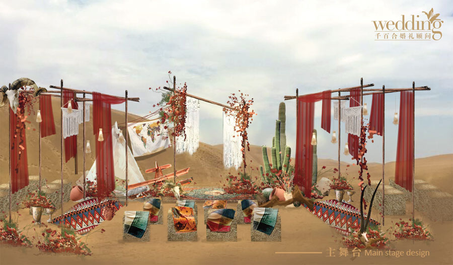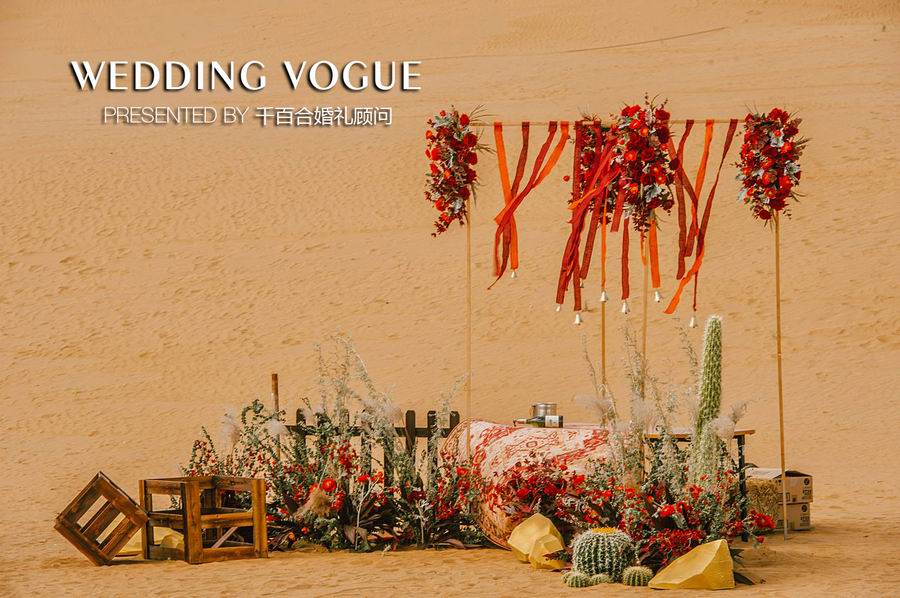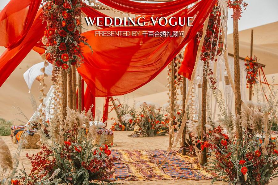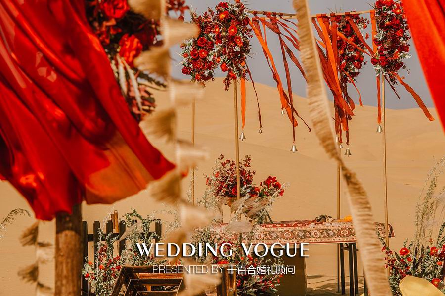 因为本就身处与大自然浑然天成的沙漠,所以本次千百合在婚礼设计上也本着因地制宜的设计理念,以结合沙漠特有植物沙柳,搭配民族风情的物件进行造景,色彩上则采用了与沙漠颜色形成强烈对比冲突的酒红色为主色调。