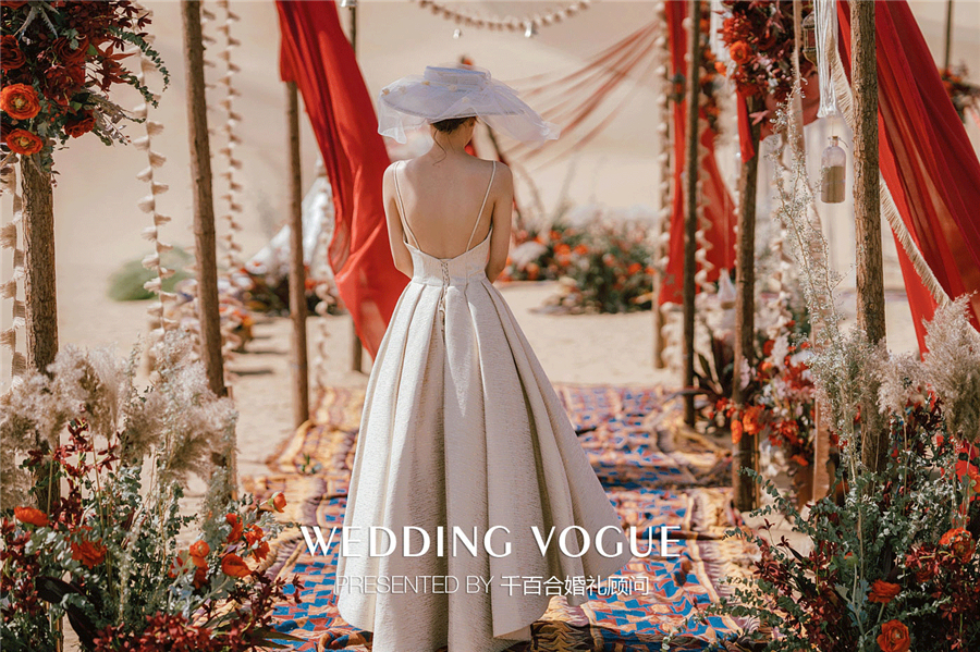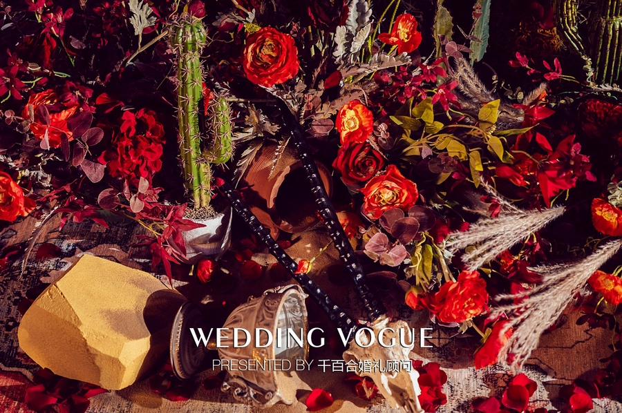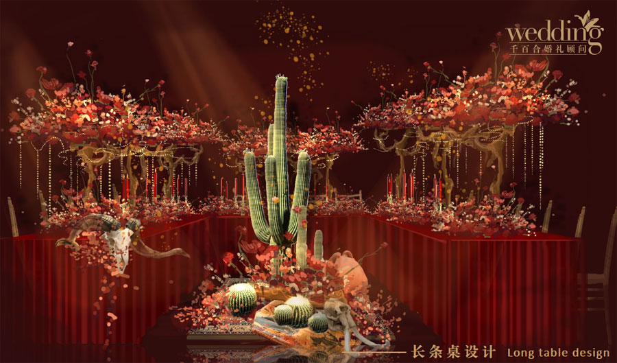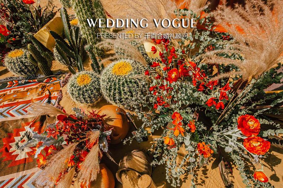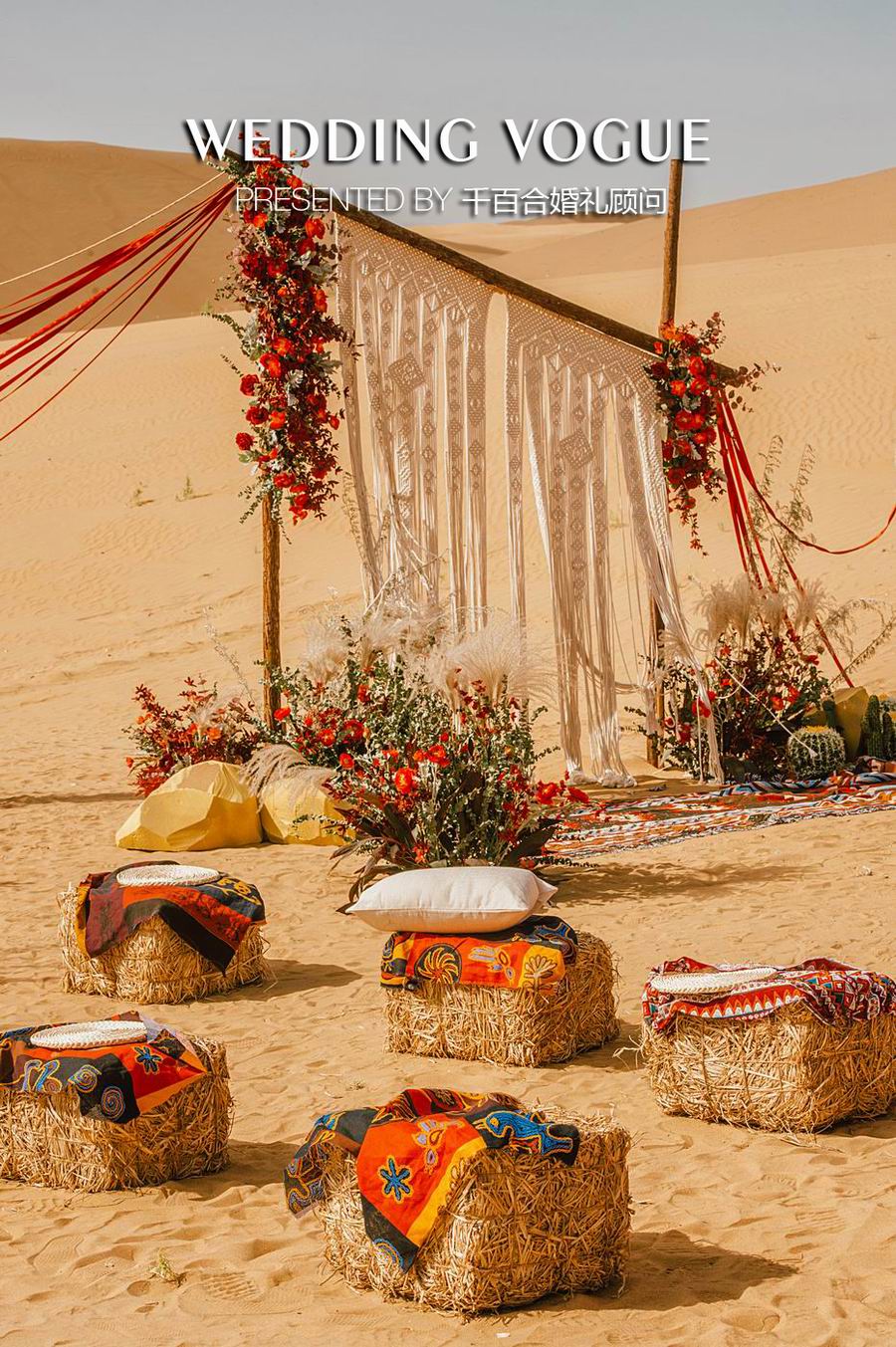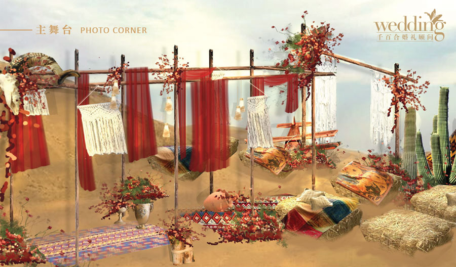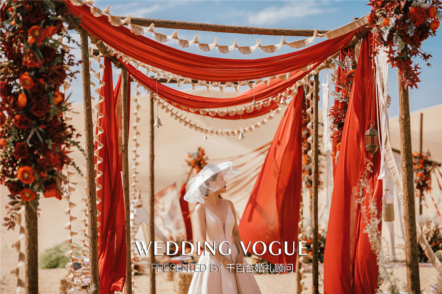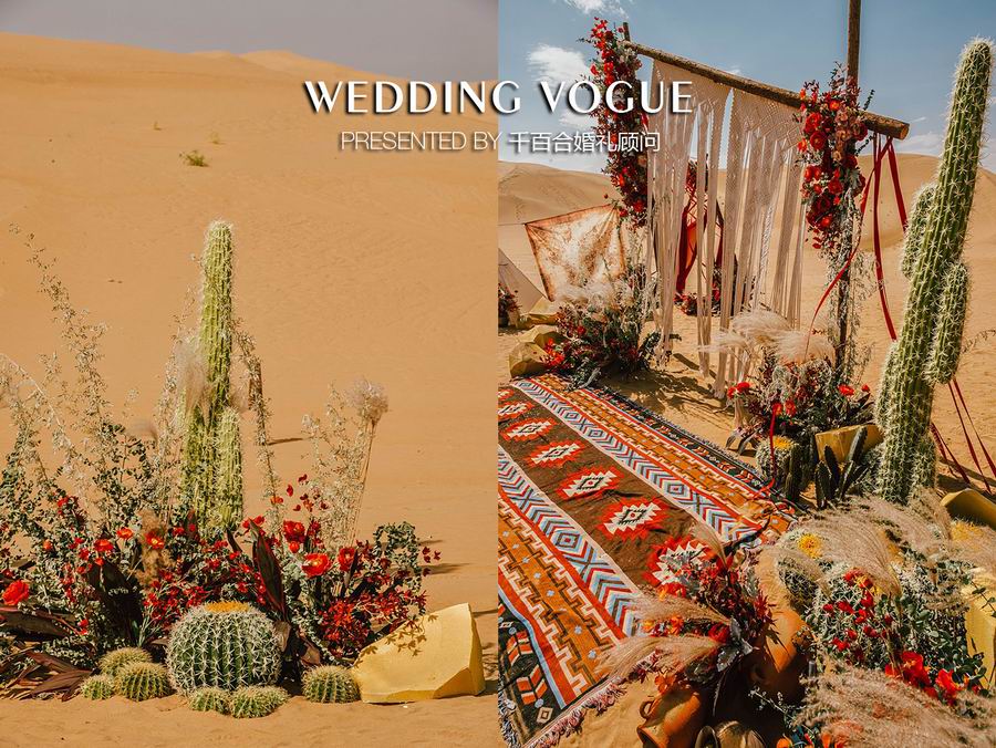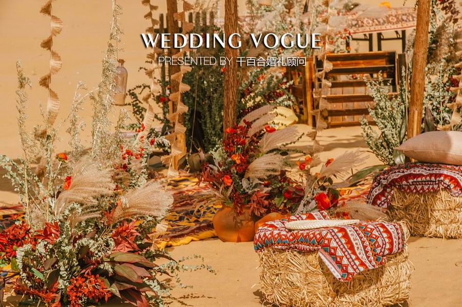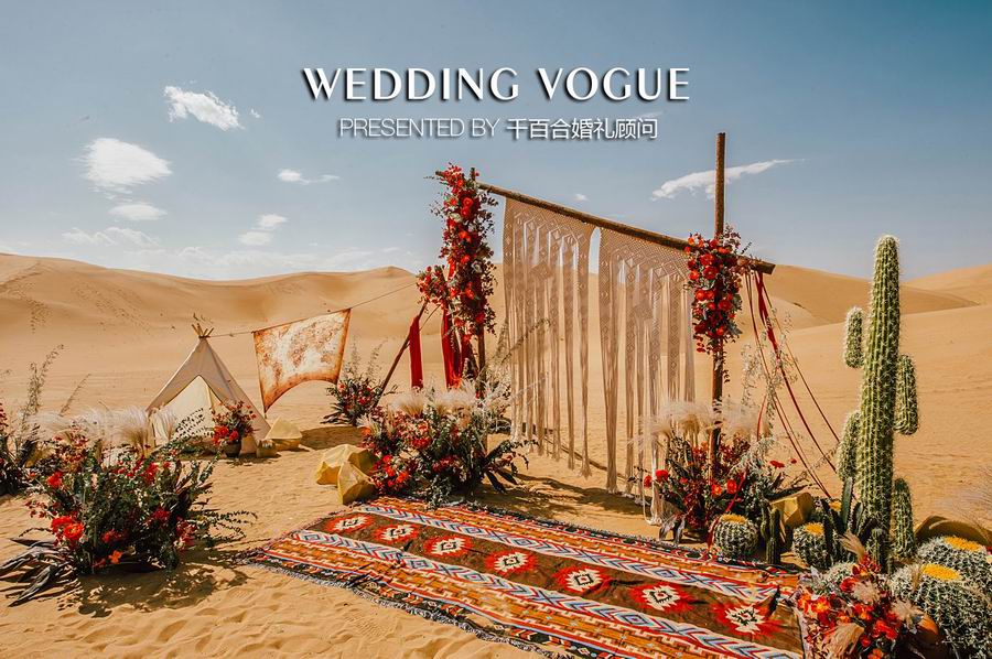 因为本就身处与大自然浑然天成的沙漠,所以本次千百合在婚礼设计上也本着因地制宜的设计理念,以结合沙漠特有植物沙柳,搭配民族风情的物件进行造景,色彩上则采用了与沙漠颜色形成强烈对比冲突的酒红色为主色调。