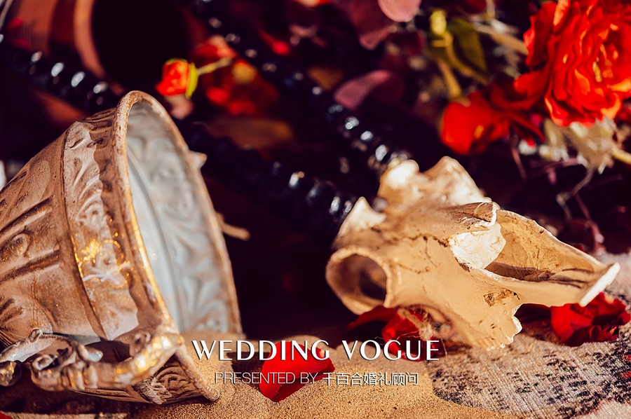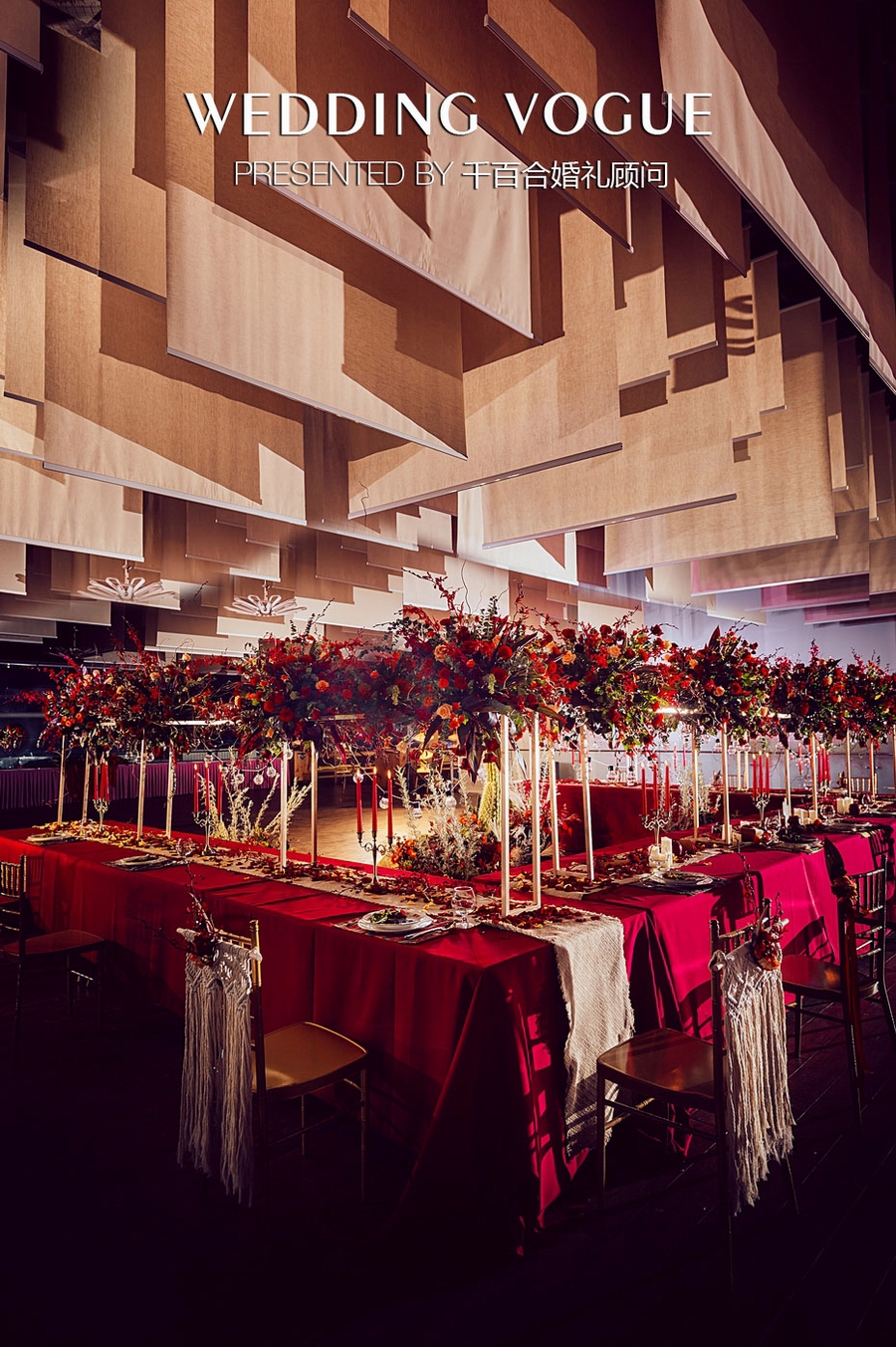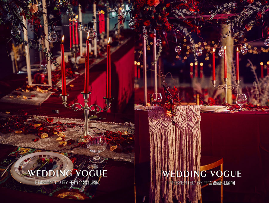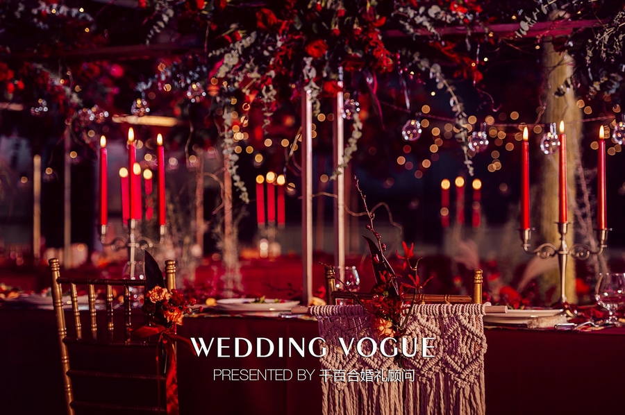 而酒红色的主色调在耀眼阳光的映射下,也让婚礼本身也充满了神秘感和生命力。