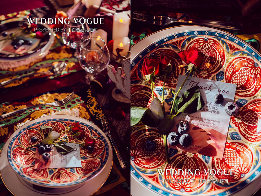 室内晚宴的部分,设计师采用了浓烈的红色与热带的绿色相搭配,在延续户外神秘感与生命力的同时,也将晚宴小而精致的氛围感受烘托而出。而在晚宴用餐结束后,新人还特别安排名族特色篝火晚会,以让来宾尽情狂欢。