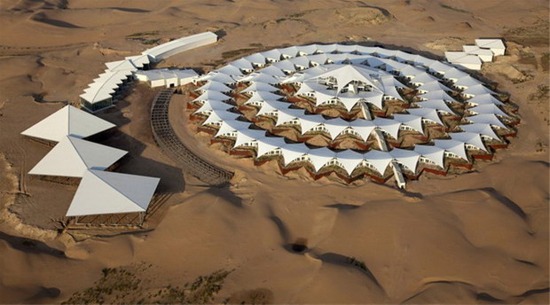 婚礼晚宴被安排了在库布其沙漠上的莲花度假酒店,作为国内唯一的沙漠酒店,因从空中俯瞰神似一朵盛开的莲花而得名。莲花内亚黄色风格的酒店大堂墙面,是由沙子做成的。同时,整间酒店也是不用水泥钢筋,而是依靠绿色建筑,环保生态建造而成。
