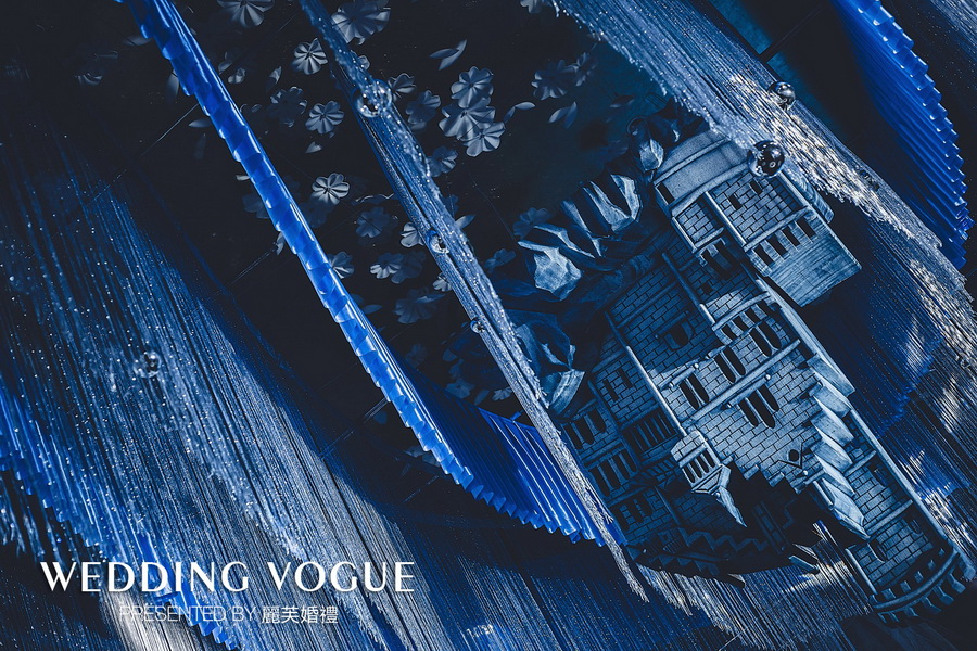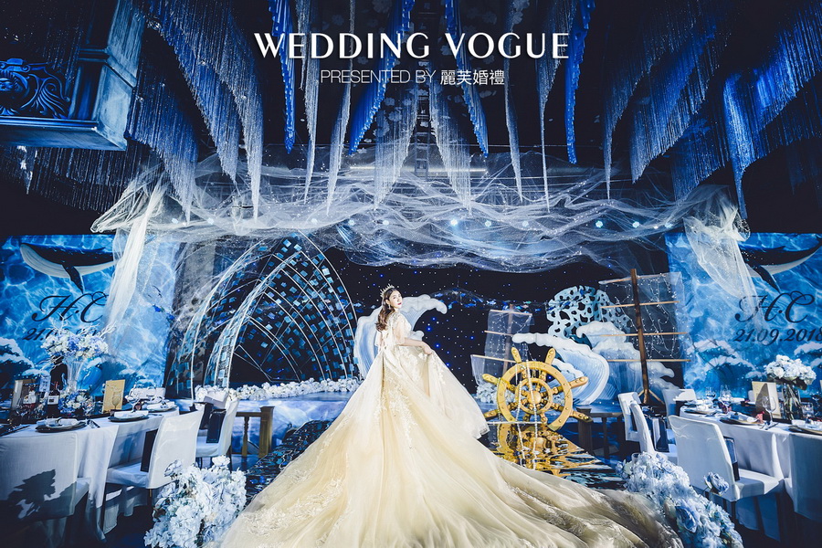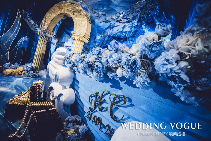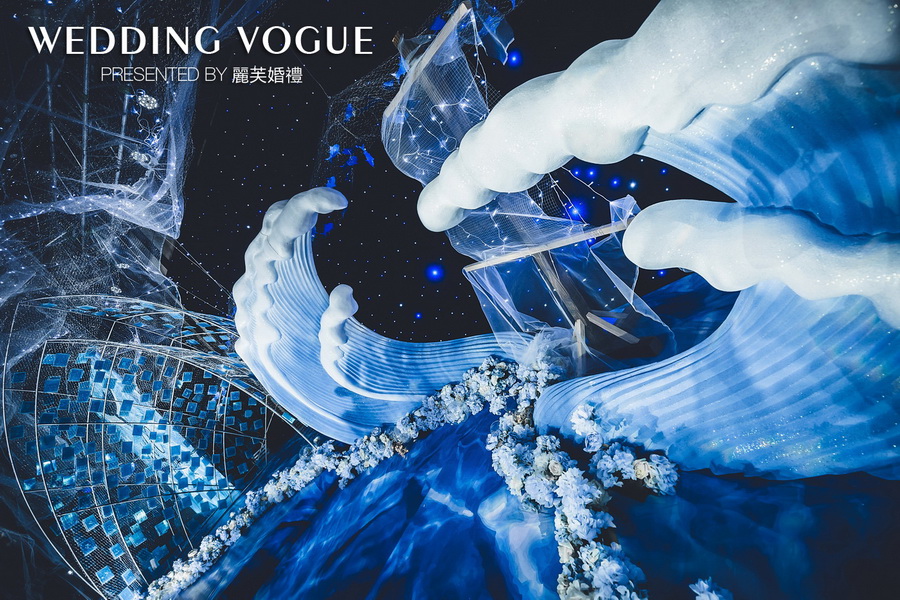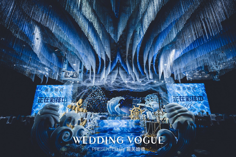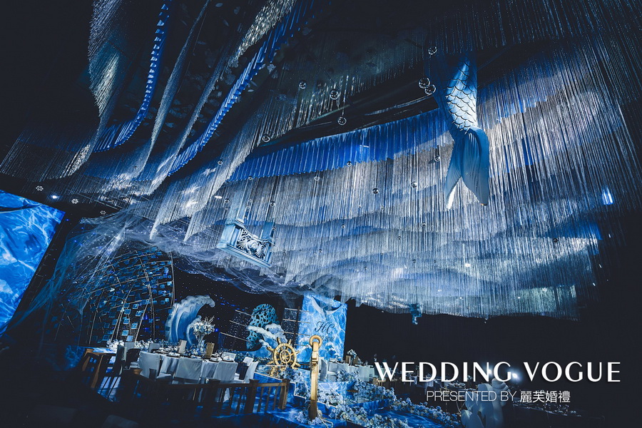 婚礼以深海蓝为主色调,LEAF麗芙婚禮用蓝色的布幔将整场婚礼包纱,增加迎宾区、签到区、主舞台、甜品的连贯性,亦是对整体深邃大海氛围的打造。