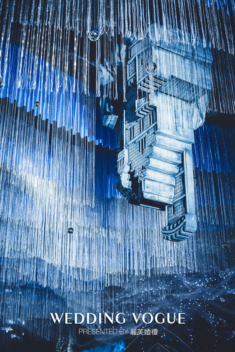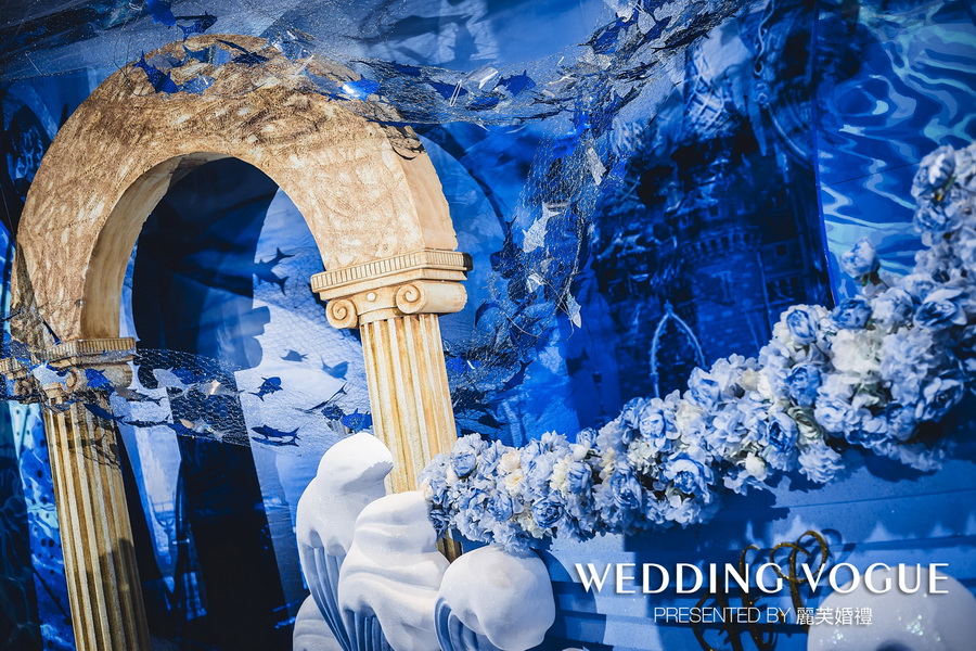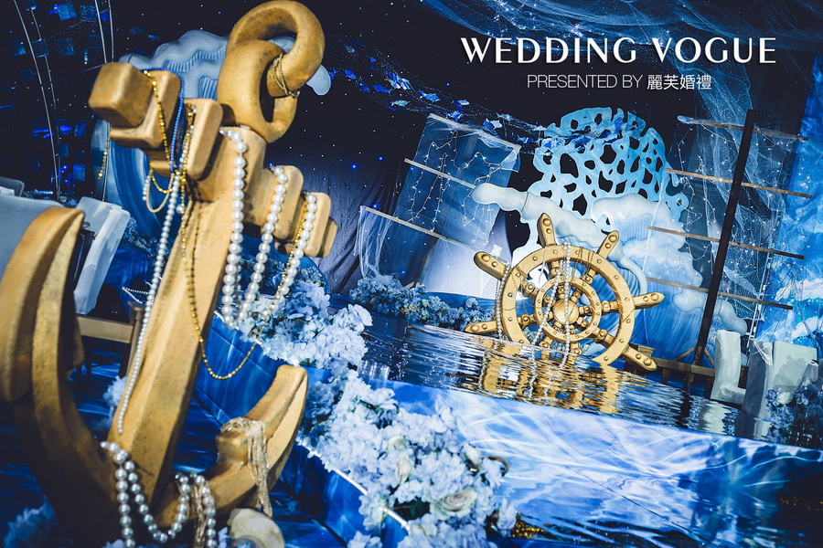 而在这样的氛围营造上,无论是迎宾区的船头、宝藏箱还是厅内倒置的拱门与城堡,将看似不属于海底但又与海洋场景相得益彰的事物融入,增添玄幻感的同时也是新人故事的体现。除此之外,金色的加勒比海盗风格元素与整体海蓝色的撞色搭配,也使得这场海洋婚礼不落于常规。