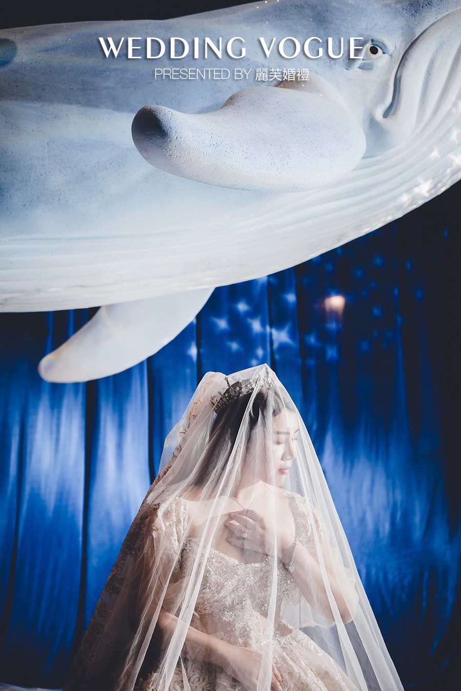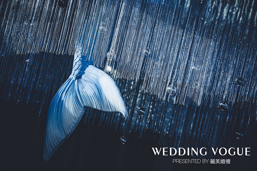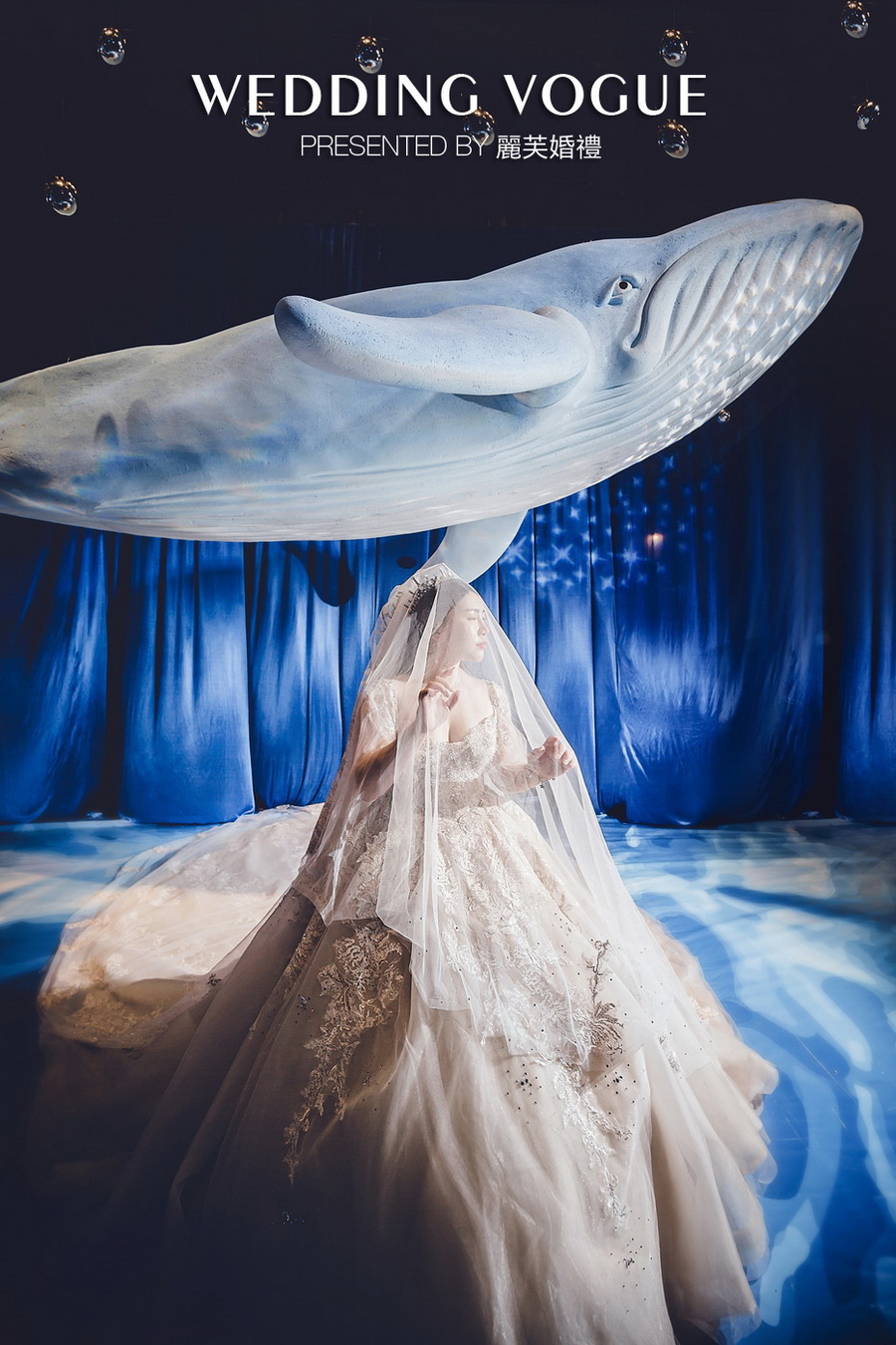 新娘从一只6米长的鲸鱼旁出场,这只鲸鱼就像一只守护兽,与新娘的女王气质浑然天成,也守护着新人不渝的爱情。