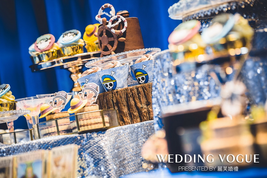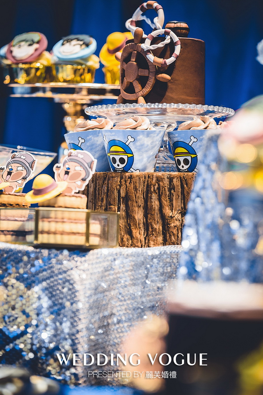 除了现场的场景设计,就连甜品也是海贼王的异形体现,在整体制作上,洛蜜塔婚礼甜品台使用了大量的糖霜造型,例如海浪、沙滩、章鱼等,而主蛋糕是海贼王中梅丽号在海上航行时的状态,象征着新人的爱情起航。