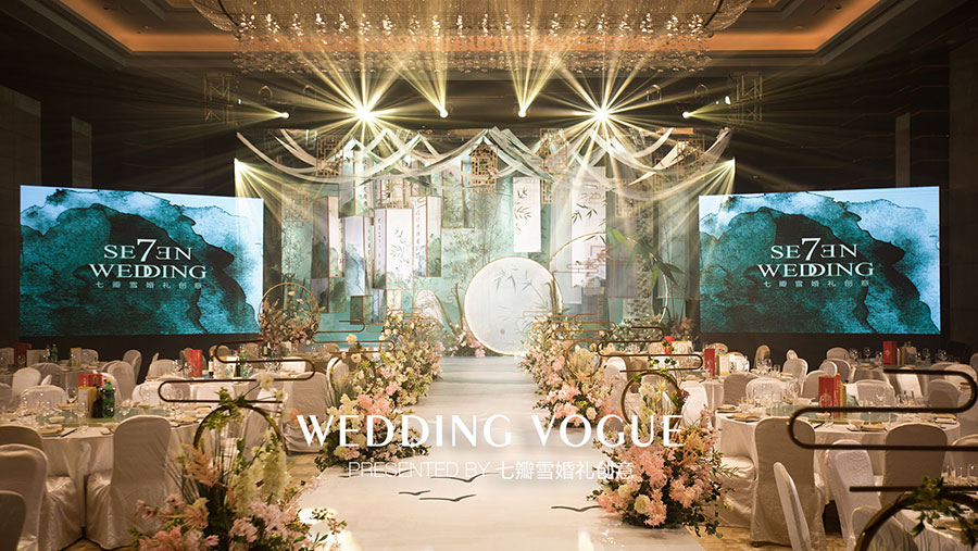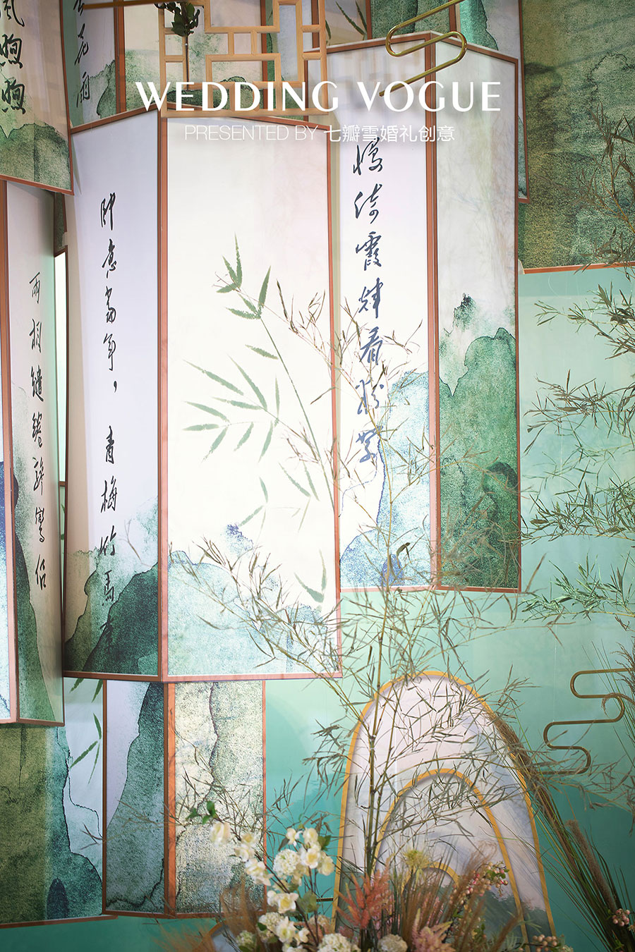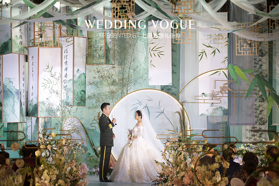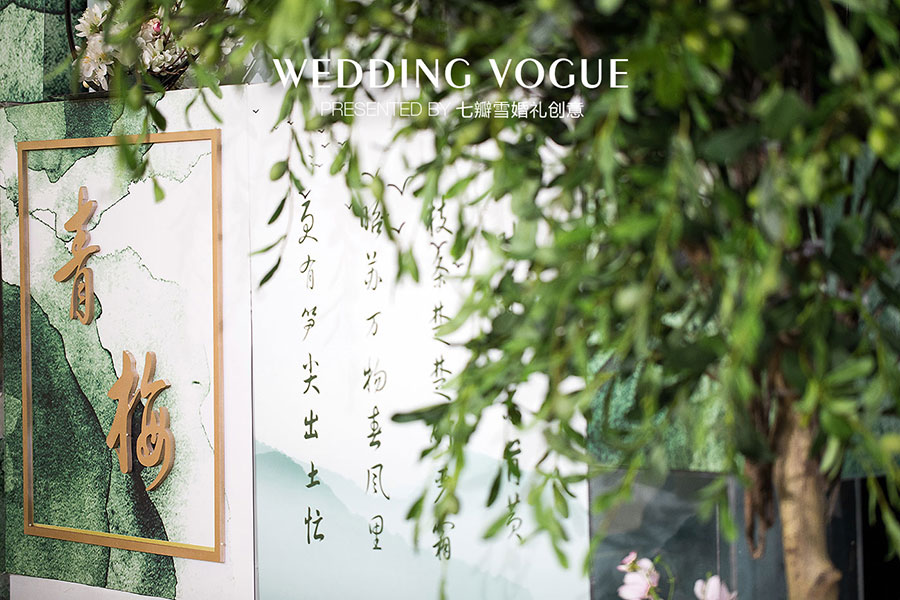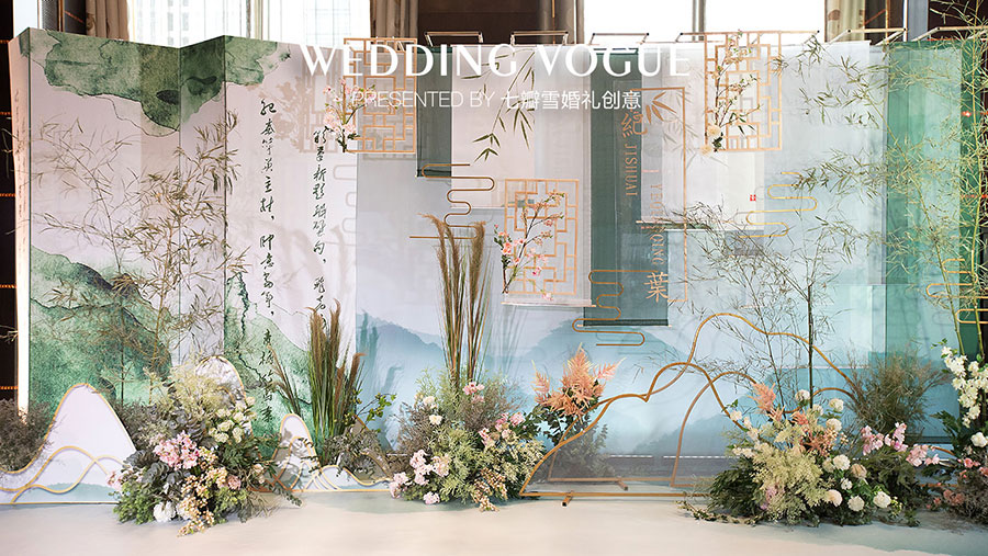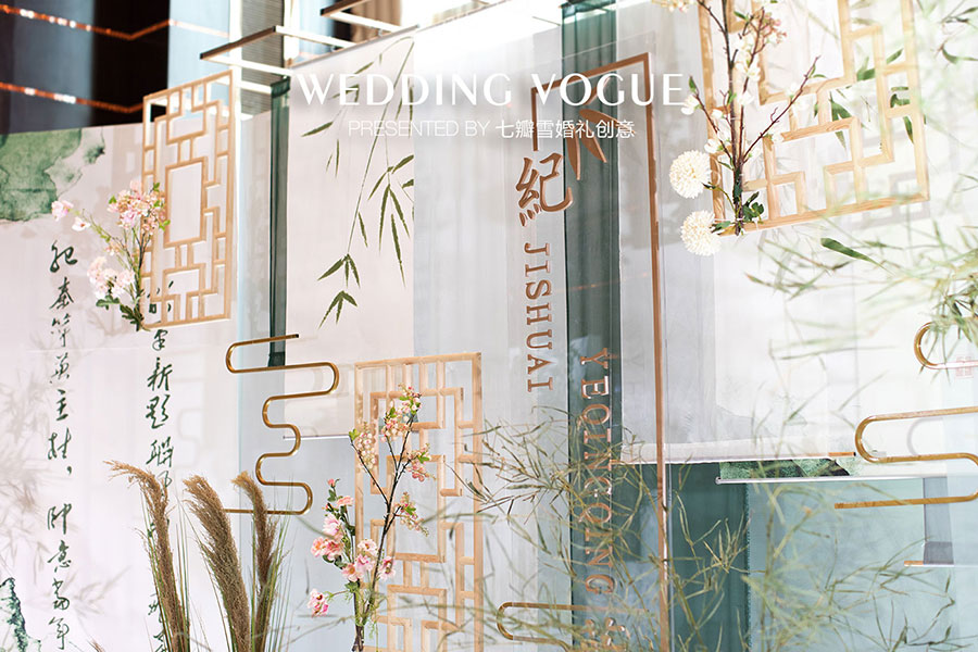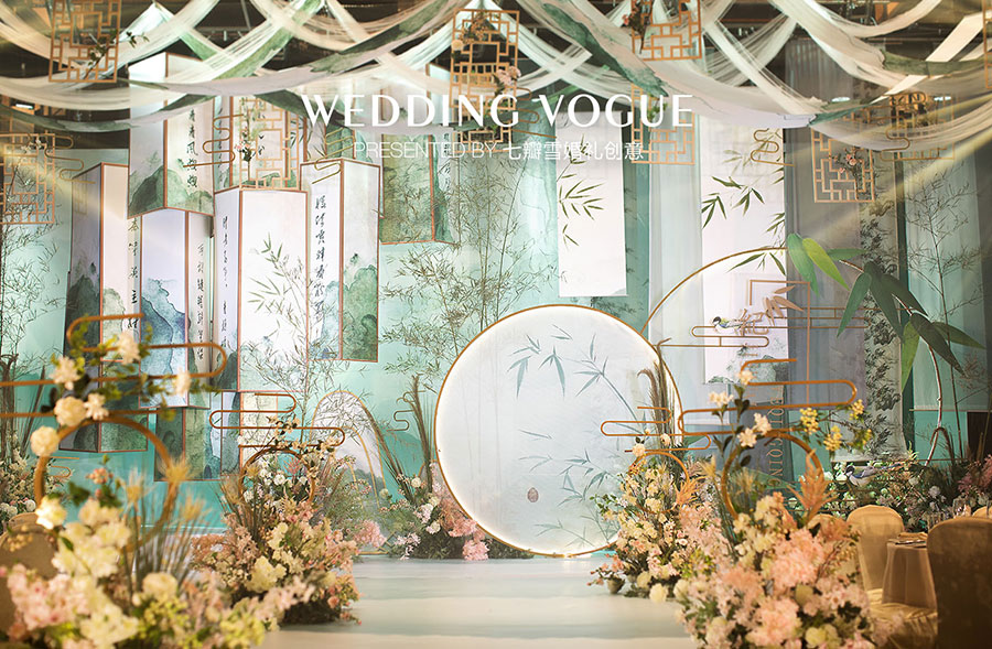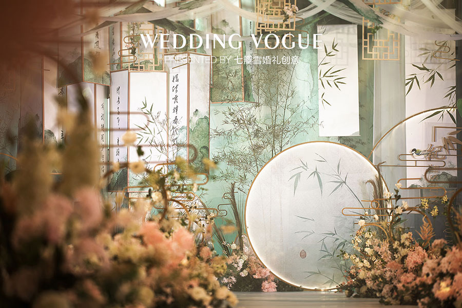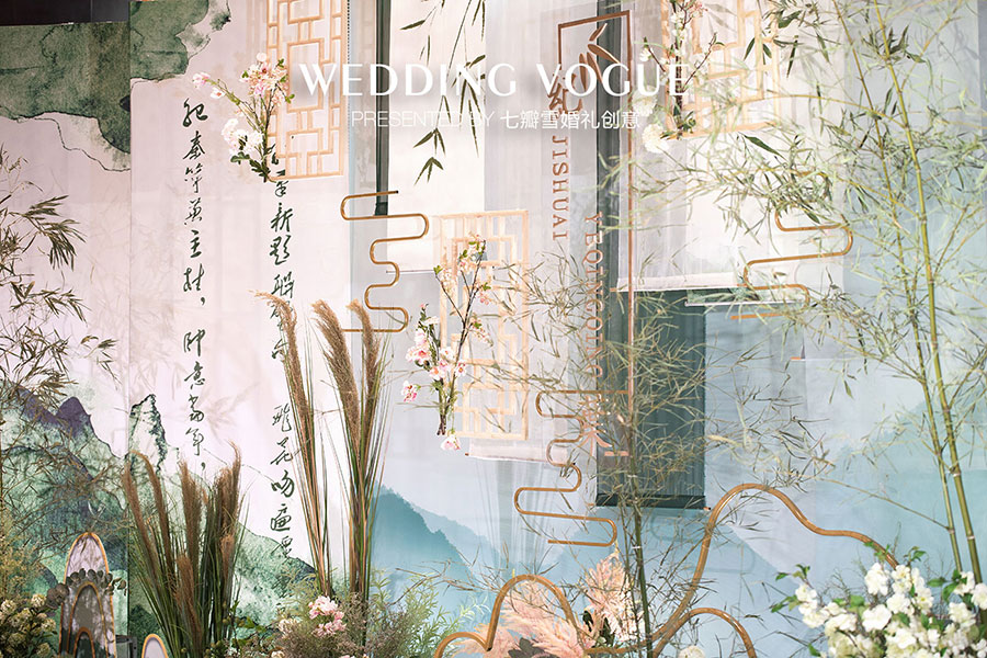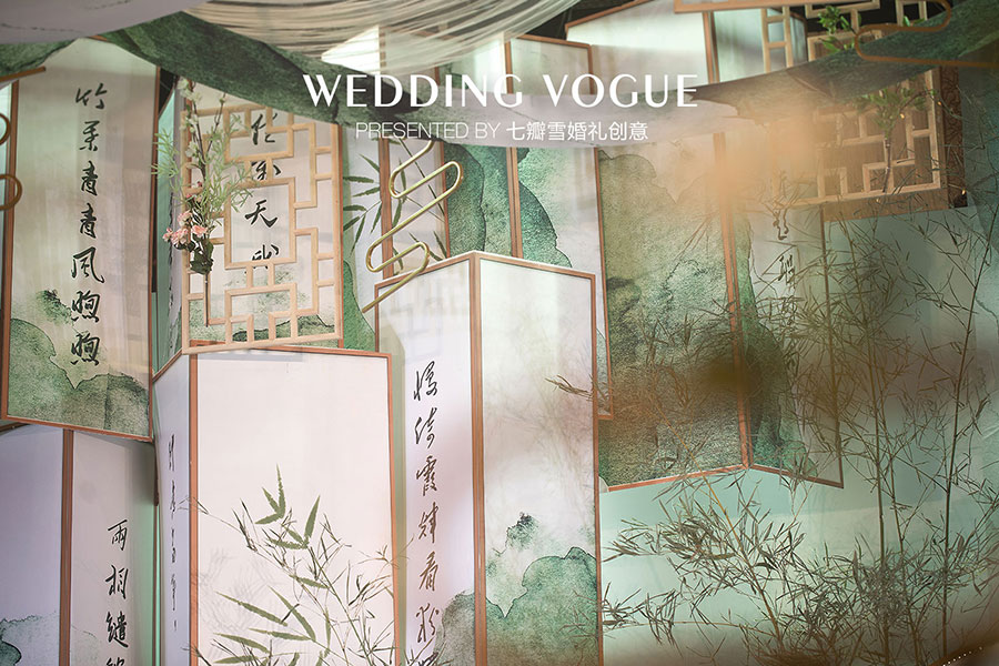 在婚礼设计中,七瓣雪婚礼创意做了一场似文人雅士般的现场呈现,无论是主仪式区的屏风式设计,亦或顶部错落悬挂的镂空式装饰,都充满了古典韵味,也与新人浓厚的家庭文学氛围相呼应,而竹叶与诗画更是文人风骨的体现。