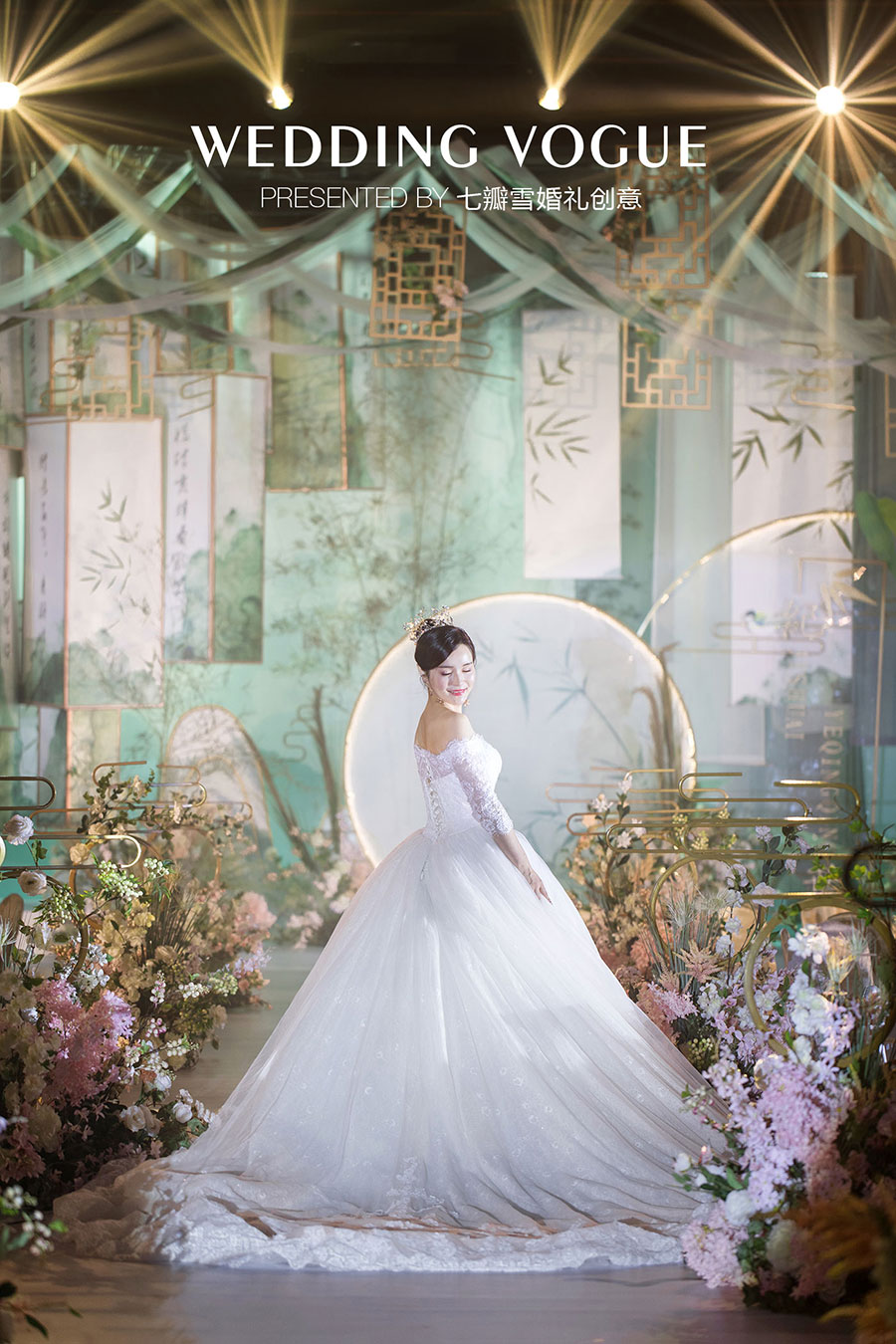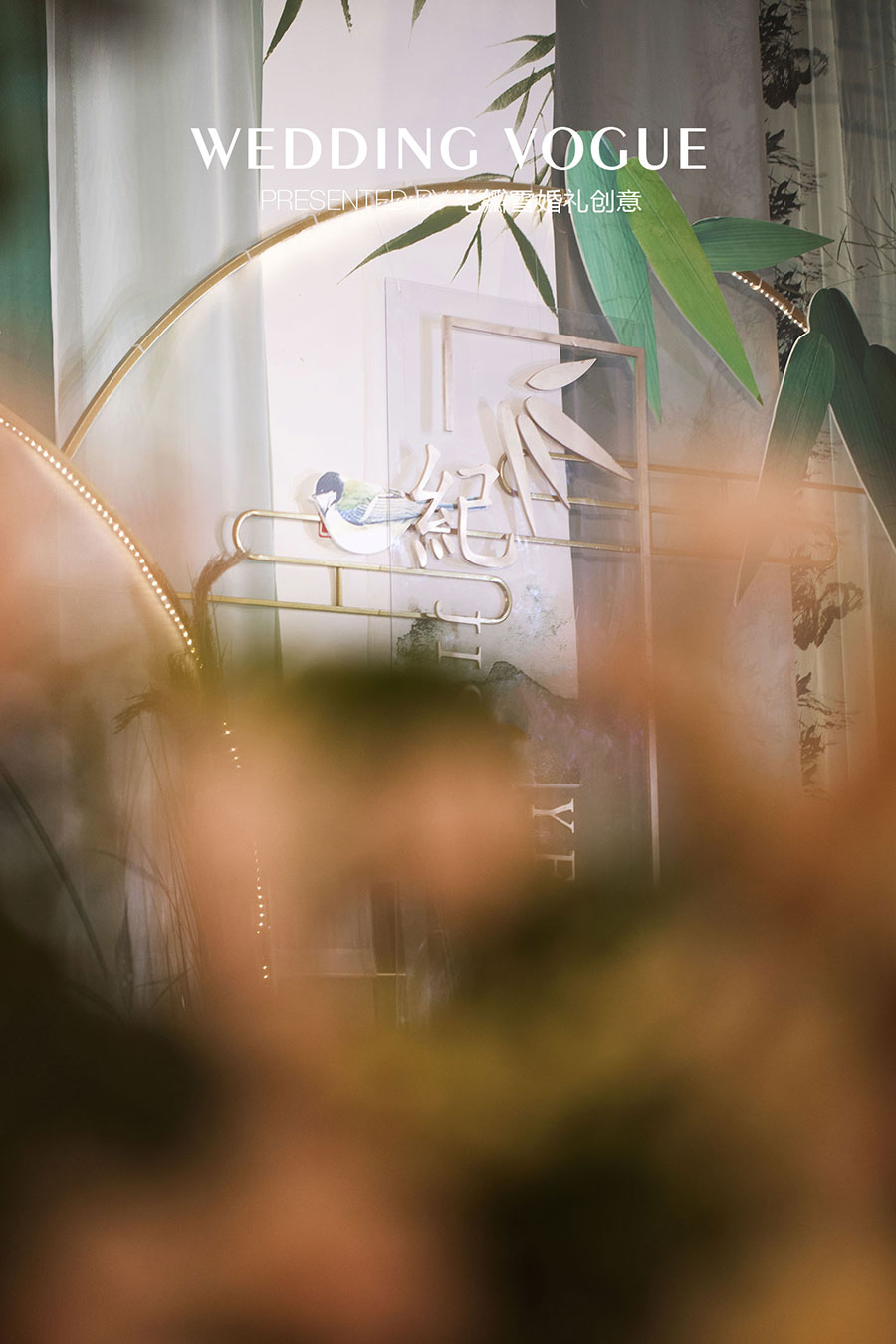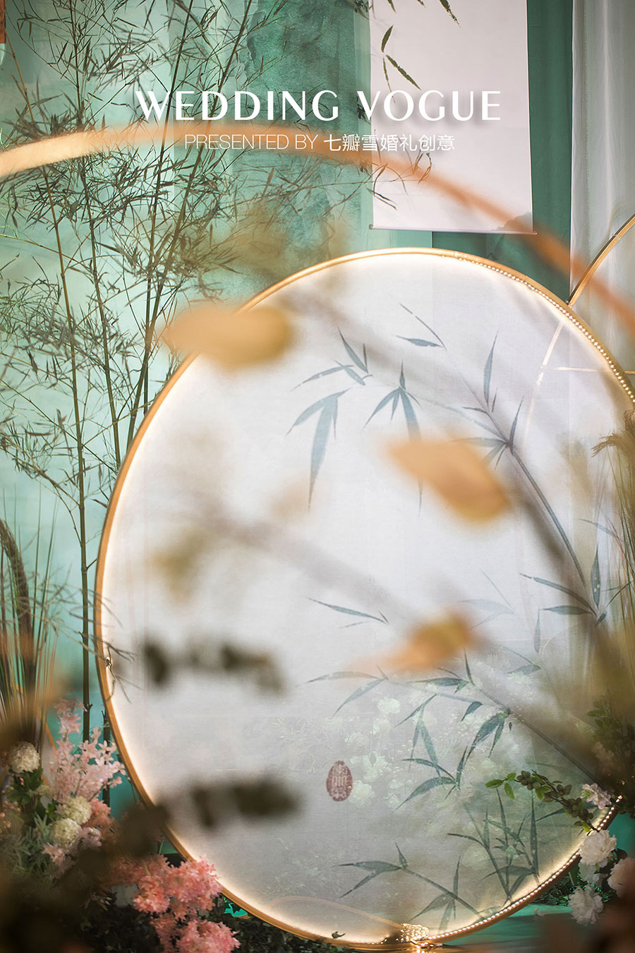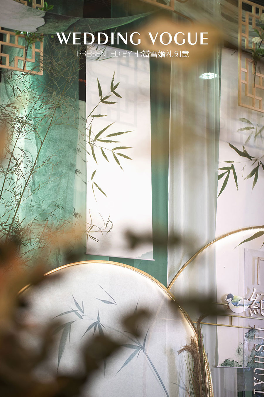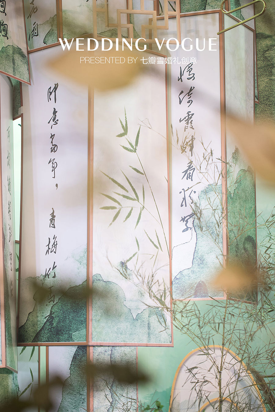 在婚礼设计中,七瓣雪婚礼创意做了一场似文人雅士般的现场呈现,无论是主仪式区的屏风式设计,亦或顶部错落悬挂的镂空式装饰,都充满了古典韵味,也与新人浓厚的家庭文学氛围相呼应,而竹叶与诗画更是文人风骨的体现。