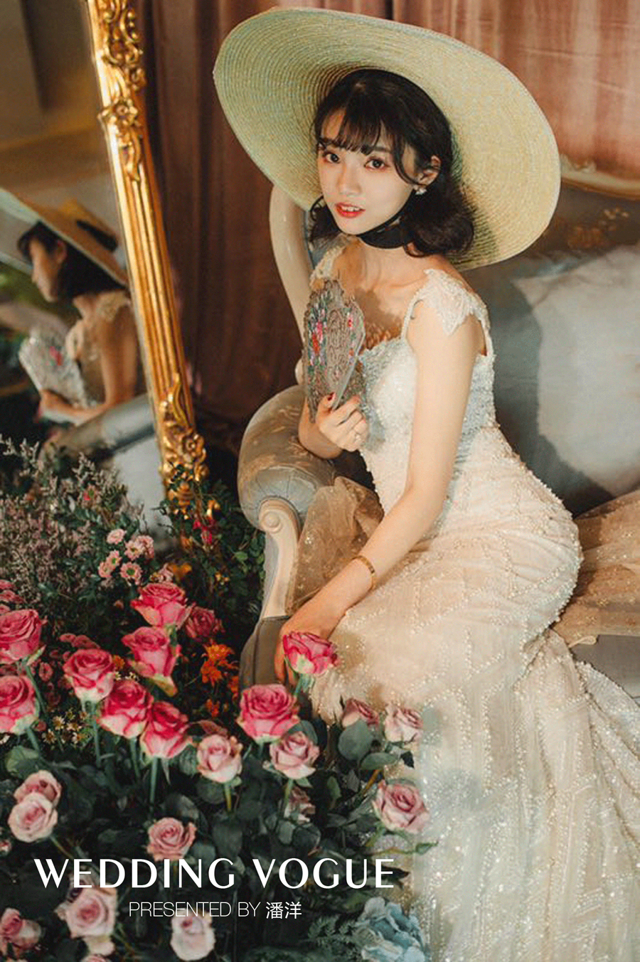 法式田园风格:新娘在场景布置中会选择花卉布景 ,在场景中,可以选择不一样的搭配,比如草编帽 、发带、面纱等。