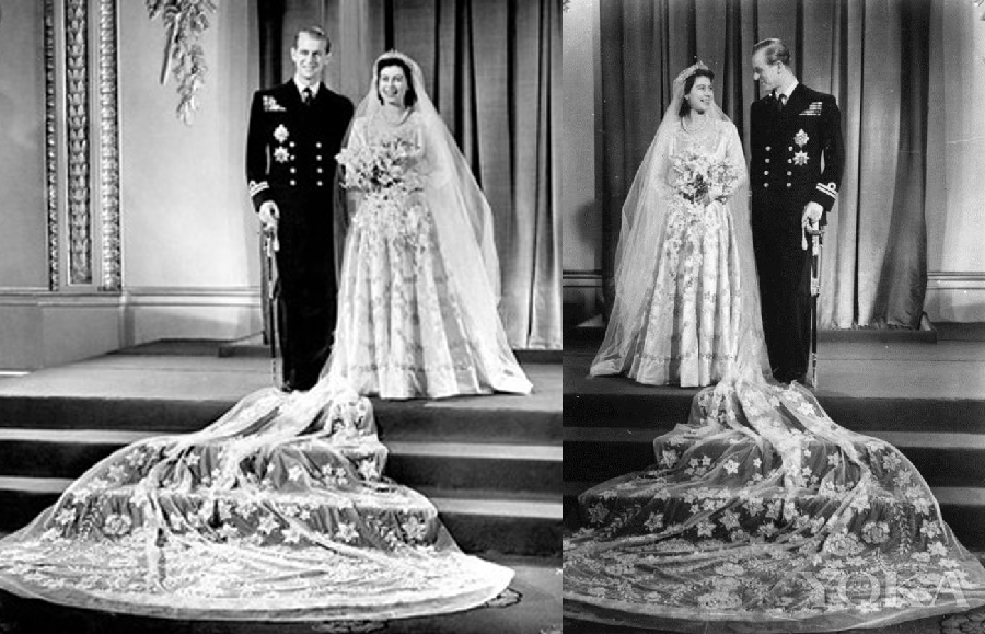 1947年,英女王伊丽莎白二世和菲腊亲王在西敏寺大教堂结婚。当时英女王婚纱以象牙白色的丝绸制成,由皇家设计师Norman Hartnell设计。婚纱上有精心绣制的星型百合和橙色花卉图案,并以一万颗美国进口的珍珠点缀,华丽经典。