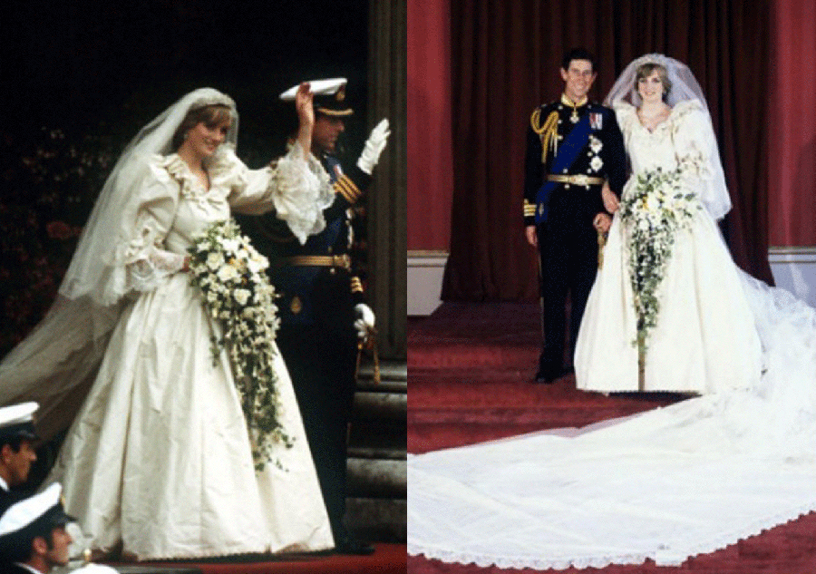 1981年7月29日戴安娜王妃的世纪婚礼,精美的乳白色塔夫绸拖地礼服,裙摆长达8米,婚纱上镶有1万多颗手工缝制的珍珠,一样也是惊艳了世人。
