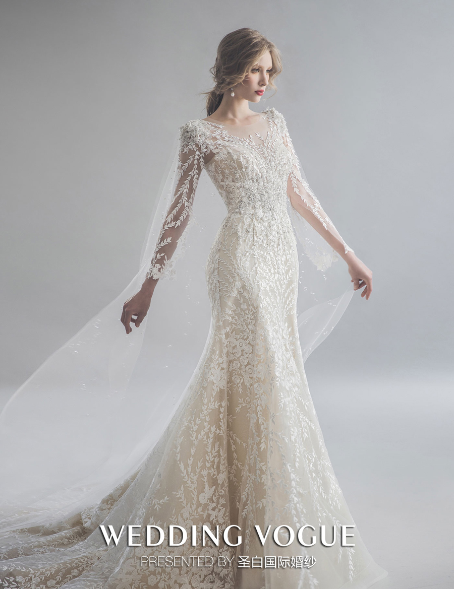 拖尾婚纱适合于教堂等传统的场所,看起来更加正式、也更加神圣。