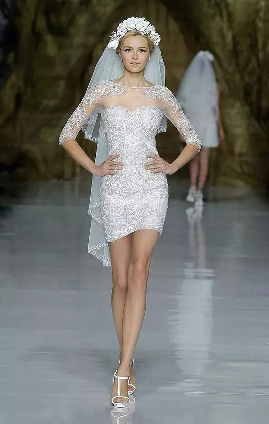 短款婚纱:这款婚纱非常恬静可爱,裙摆一般到膝部的位置,适合温婉可人的新娘,整体的感觉轻盈可爱,这种婚纱适合在户外或者是海外婚礼中穿。