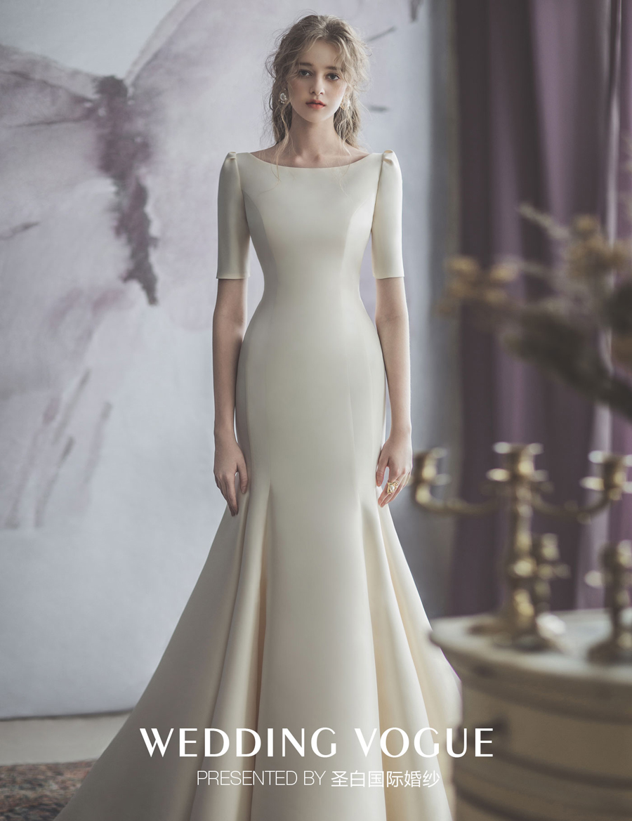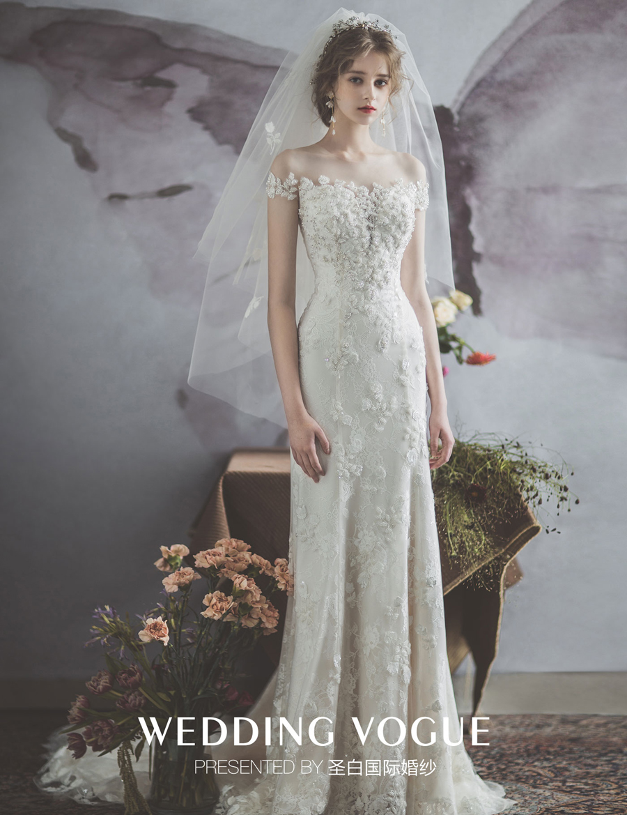 一字肩/卡肩式,这两种款式可以是有袖的设计,也可以是无袖的。它的特点就在于它能最大化展现新娘的锁骨,这种风格更为柔和细腻,也是一种非常好的婚纱选择。
