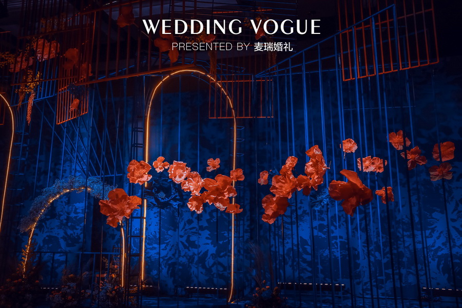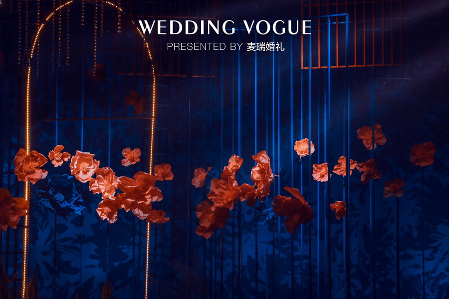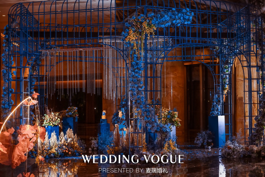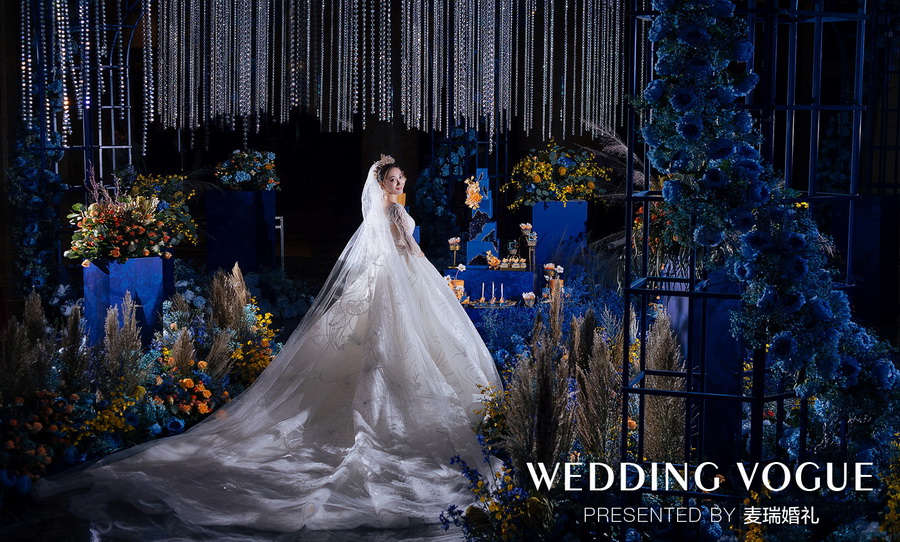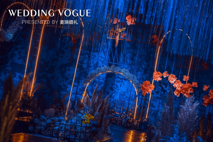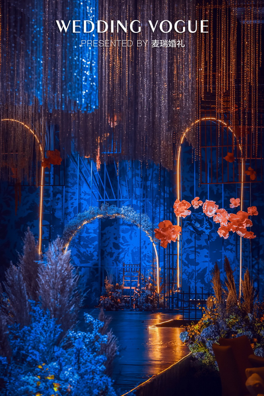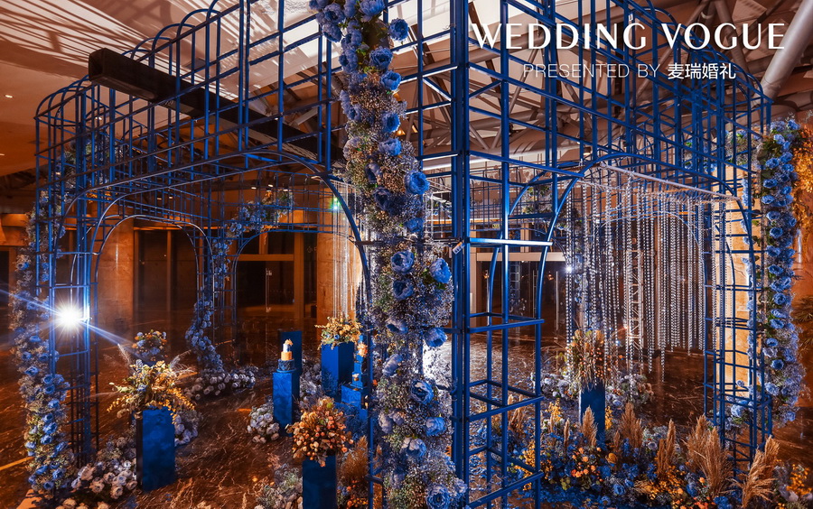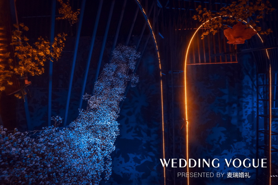 所以在此次的婚礼设计中,麦瑞的设计师就以蓝色和温馨为设计关键词,以静谧感和空间感做婚礼的氛围营造。