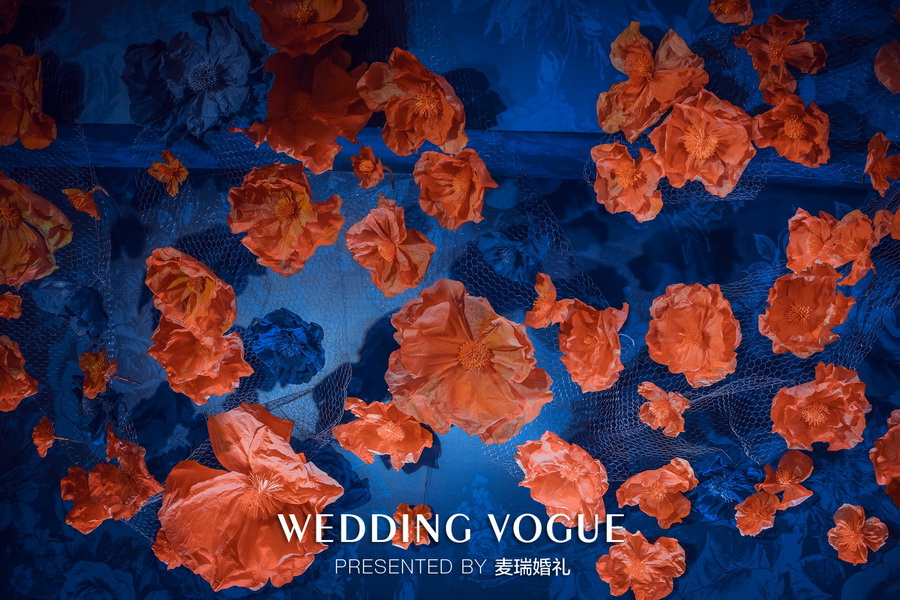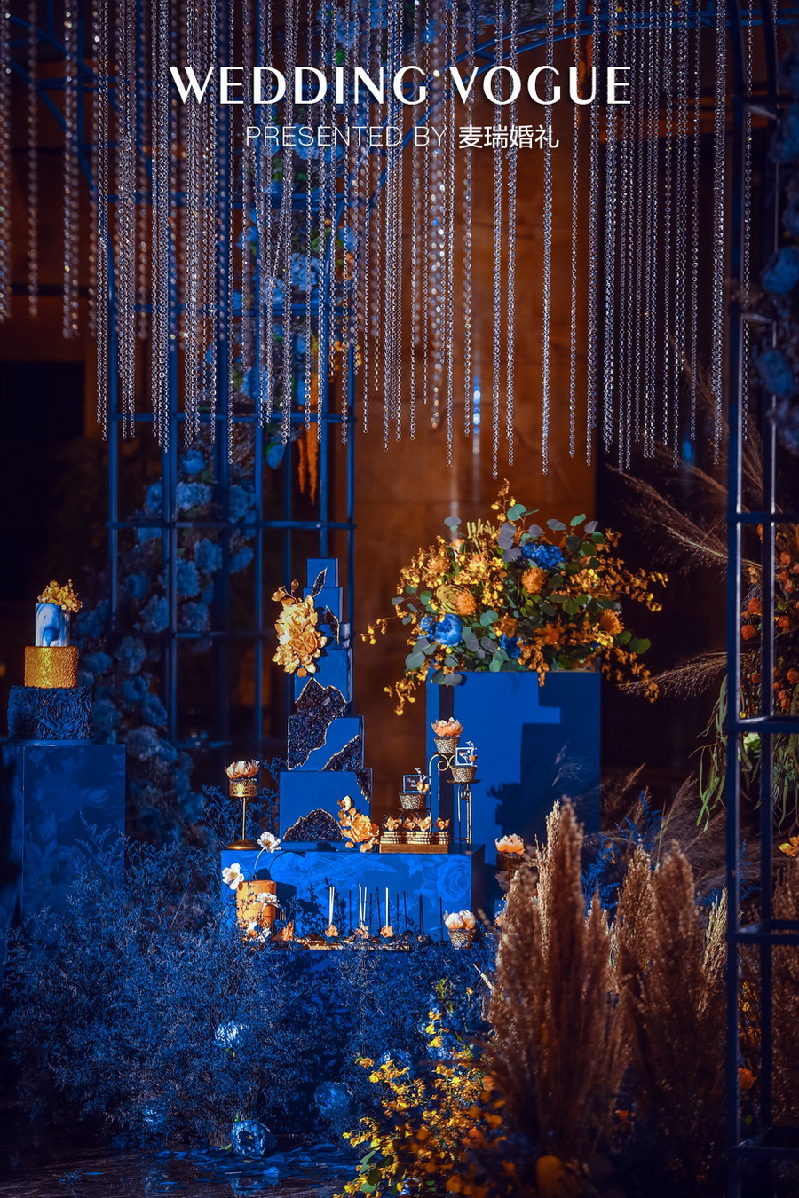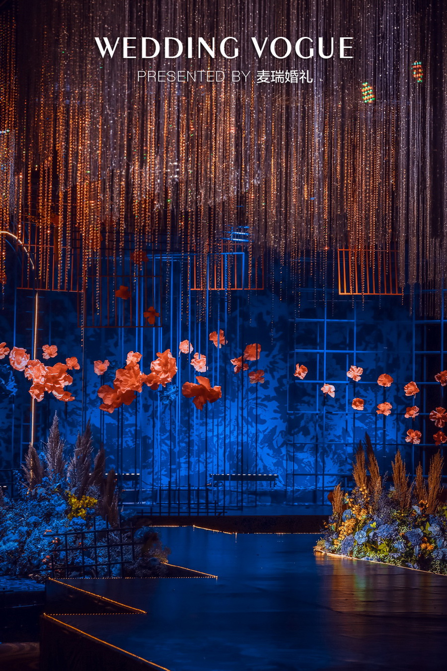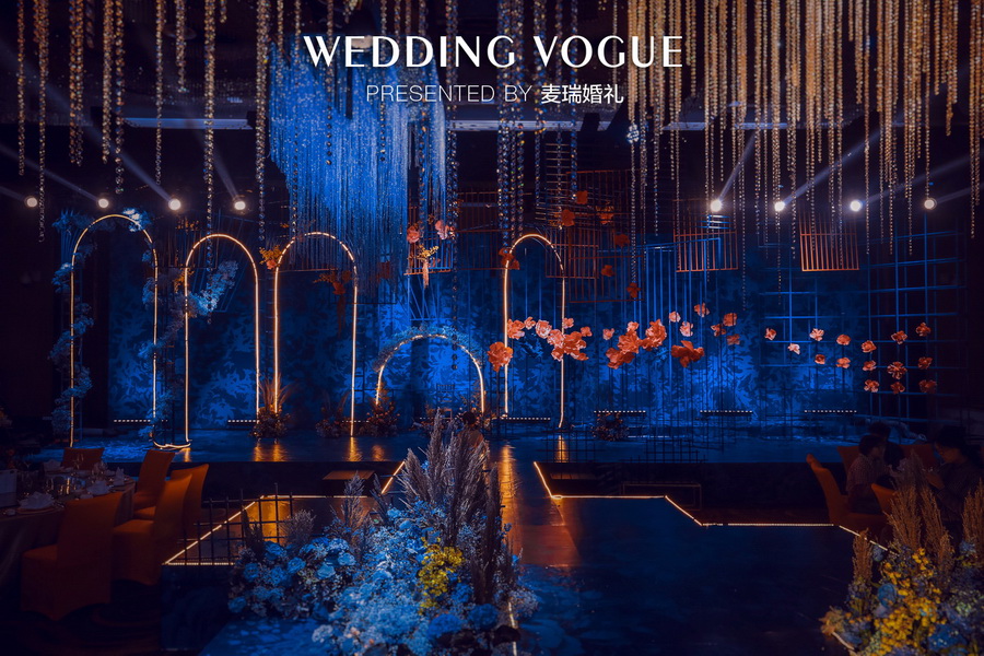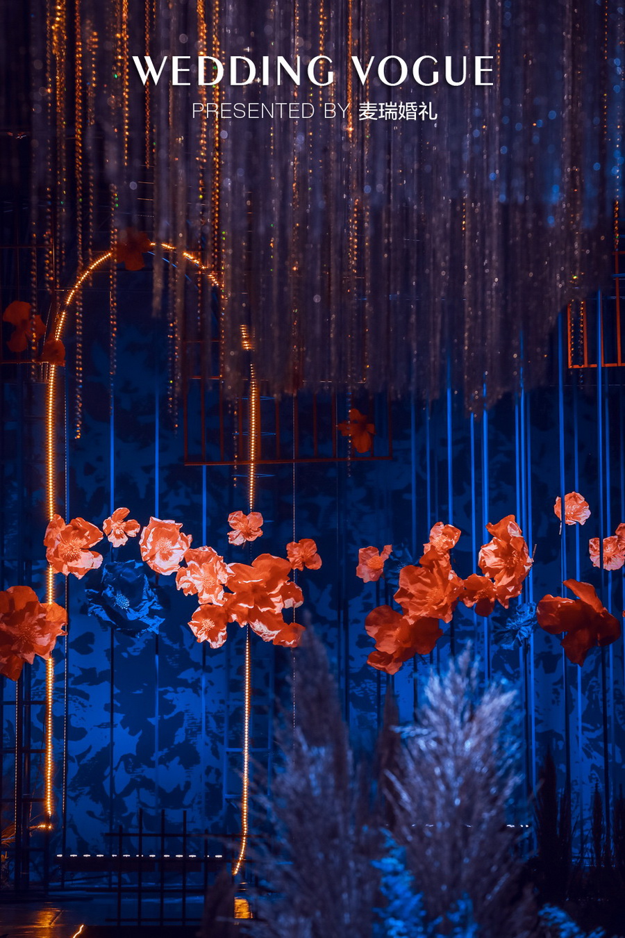 为了体现出静谧的温馨感,设计师将新娘喜欢的蓝色和温暖的橘色相融合,作为婚礼的主色调。拥有丝绒般质感的蓝色,不仅能与鲜亮的橙色相碰撞出明快的火花。这种极尽奢华的配色,也与现场优雅浪漫的西式布置完美融合。