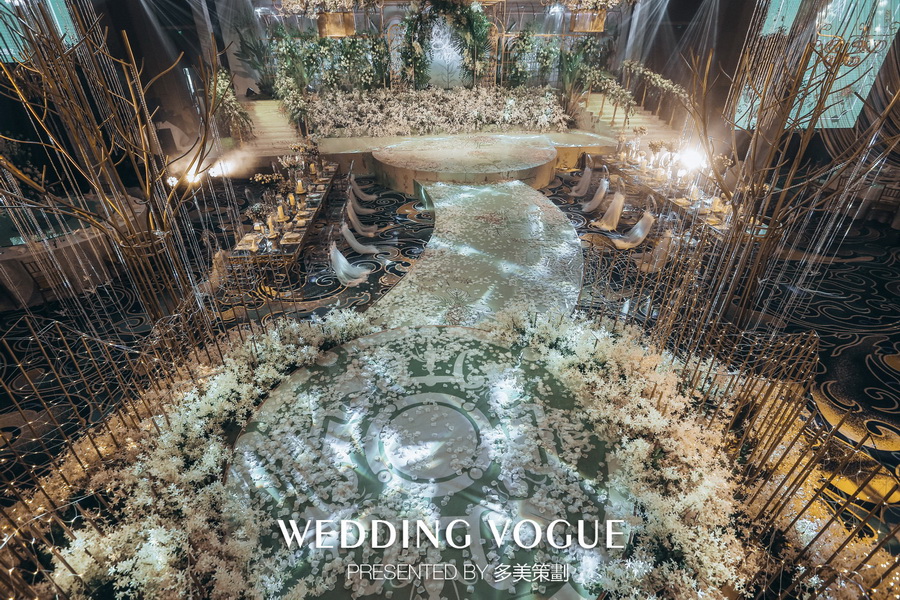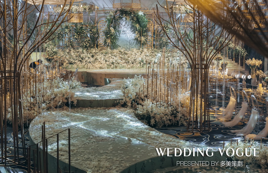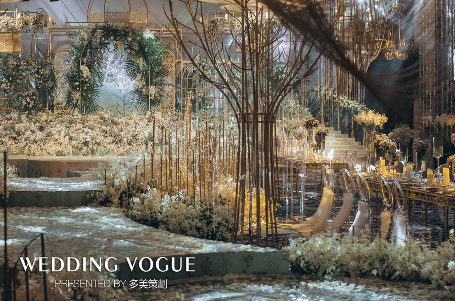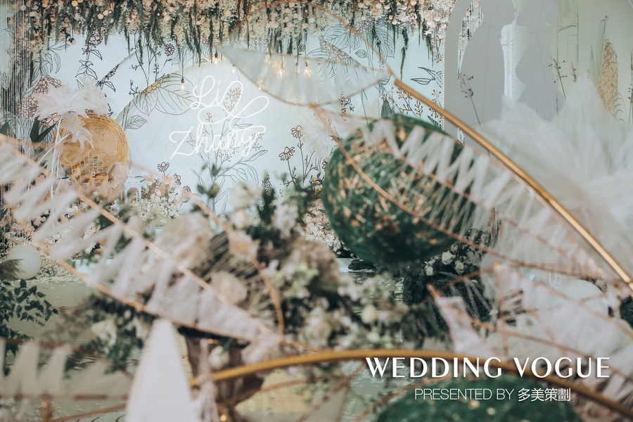 而主舞台背景,则被设计师通过经典的白绿色系与铜金色做搭配,选用多种繁茂的花材叶材和鎏金框架的道具做组合,搭造了一个隐匿在森林深处的透明玻璃花房。