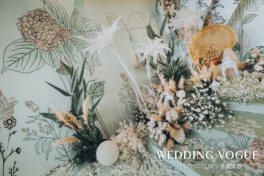 而为了能够营造出新人所希望仙气灵动之感,整个合影区都十分侧重花艺设计。此处的花艺设计被多美以“空气花艺”的形式做呈现,希望通过无风却胜似被风拂过的轻盈动态,而漾起涟漪之美。