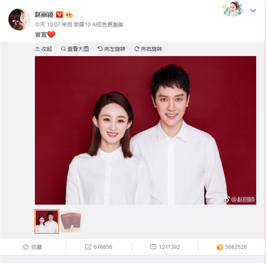 而在今天早上10点07分,赵丽颖和冯绍峰微博突然发布结婚讯息,短短两个字:官宣,引起轩然大波。