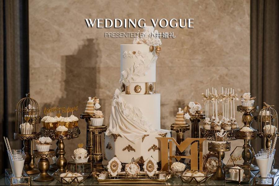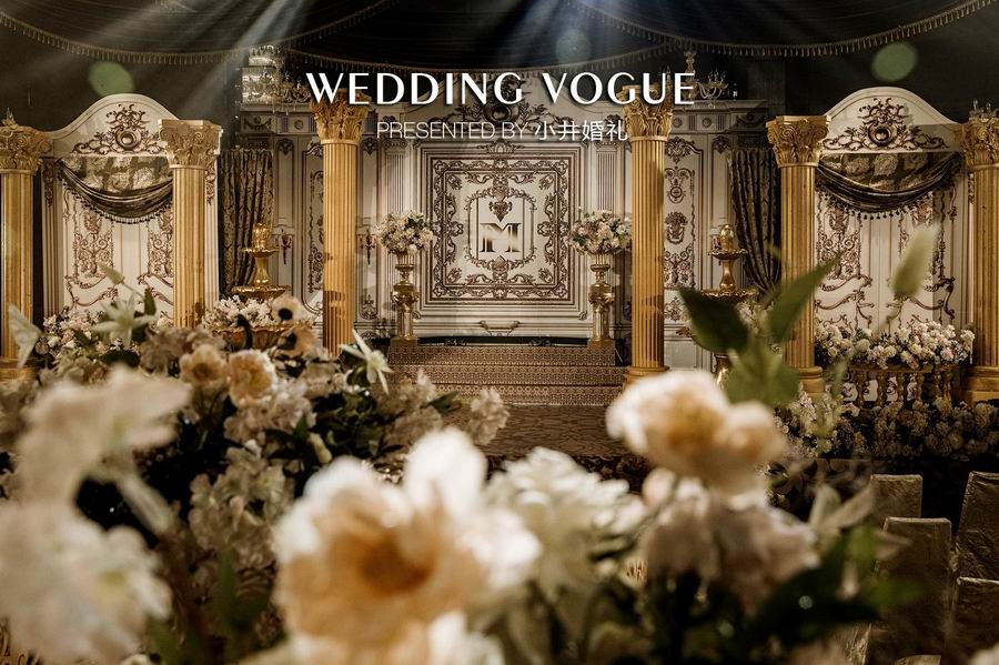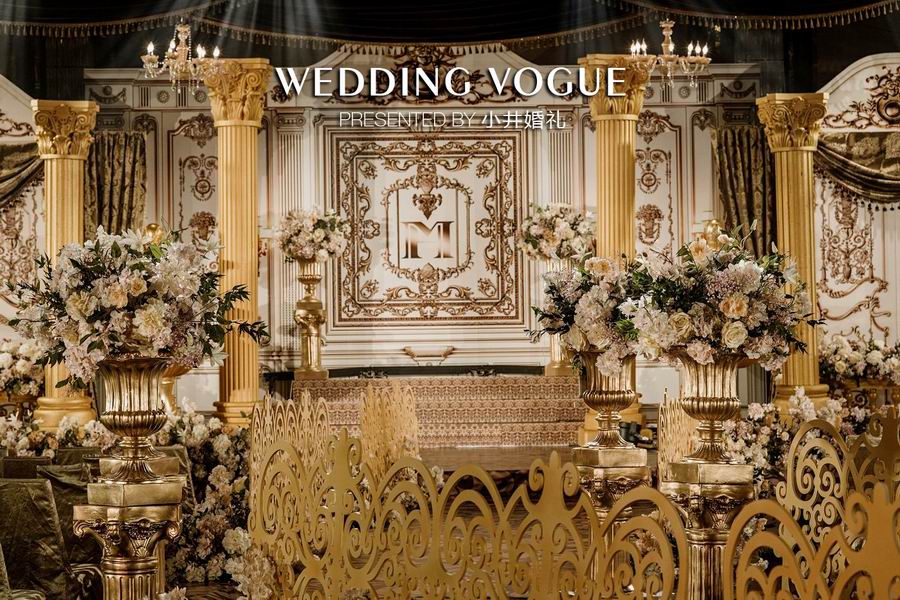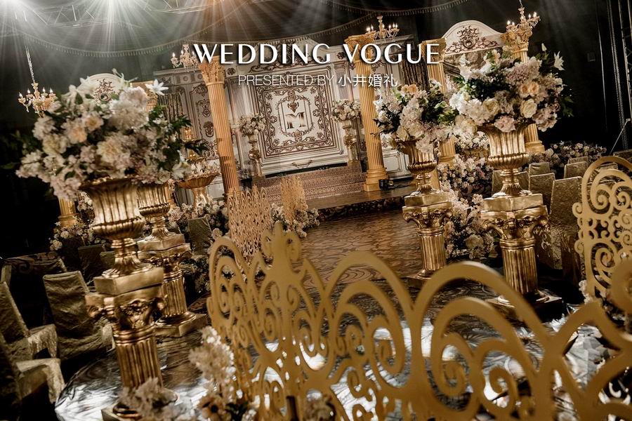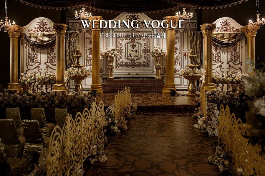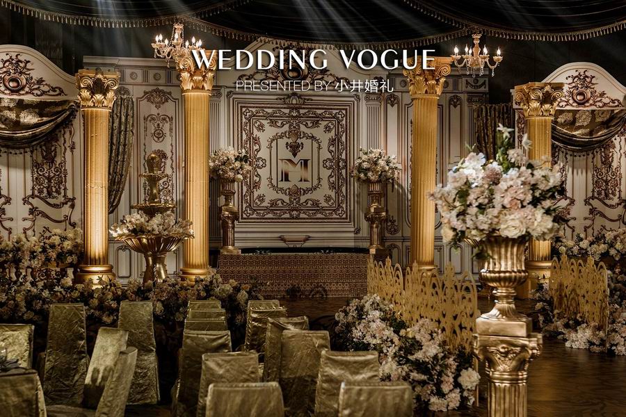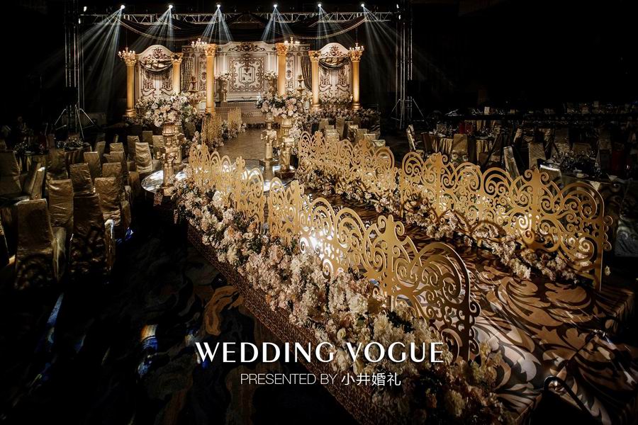 婚礼定案以迷人优雅的巴洛克风格为主题。因为求婚是在夕阳余晖下的沙滩,所以在主题色调上选用了有纪念意义的金色系:低调质感的香槟色和华丽浓郁的重金色,加以繁复精细图纹铺垫,将大量的巴洛克形象花边和精细的图纹元素融入其中,错层立体的花艺设计使整个会场更显奢华优雅,成功呈现了浓浓的巴洛克风情。