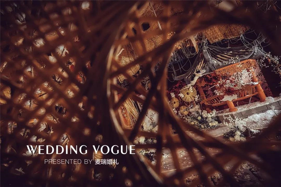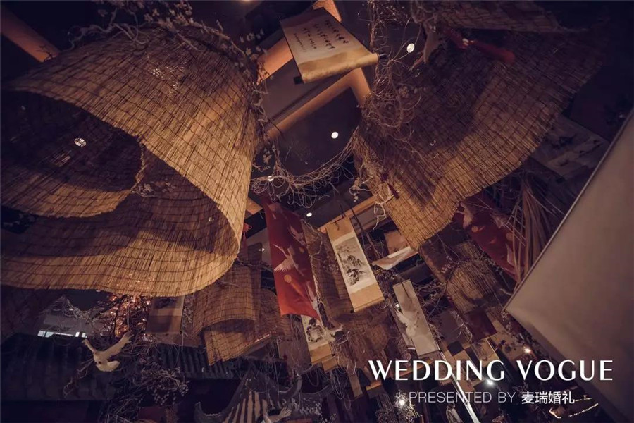 “君当作磐石,妾当作蒲苇。蒲苇韧如丝,磐石无转移”。婚礼现场的吊顶全部都用蒲苇席来作为装饰。忠贞、坚韧,像丝一样割舍不断的蒲苇就如同新人的爱情一般相濡以沫,天长地久。