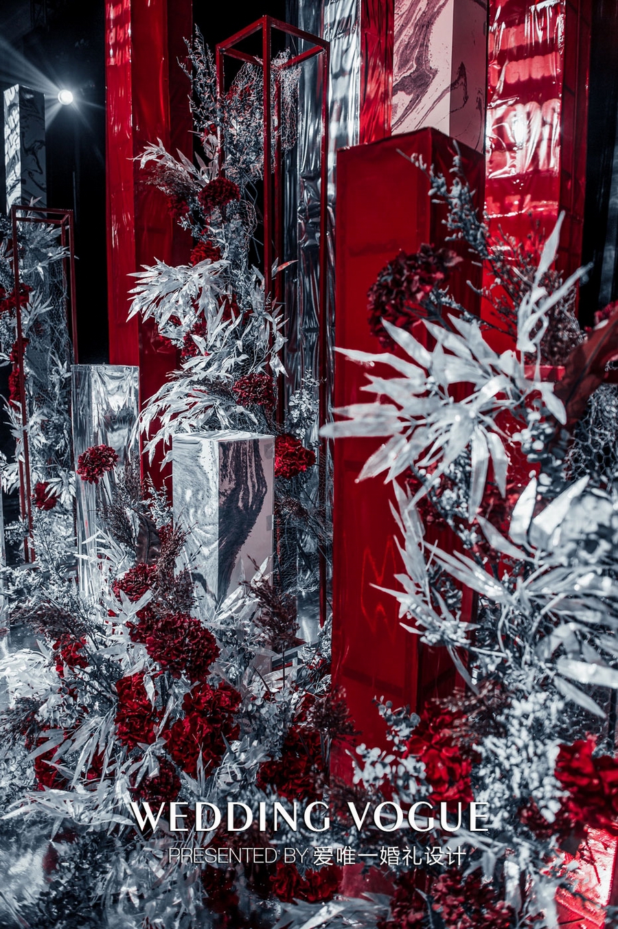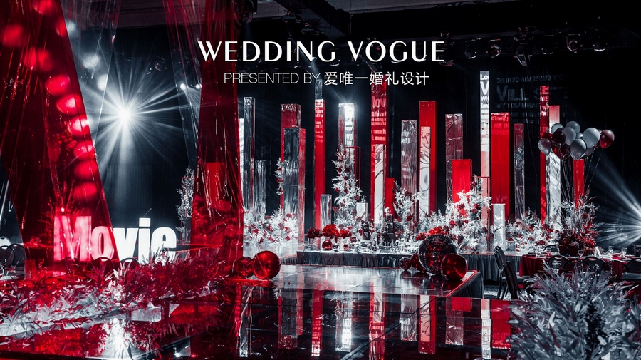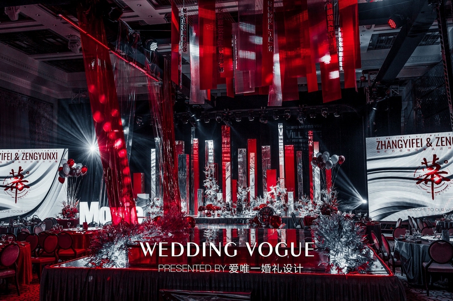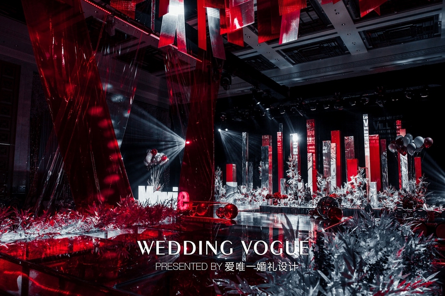 爱唯一婚礼设计在婚礼色调提炼上花费了不少心思,以玛瑙红与银色结合是他们慎重又无可挑剔的决定。