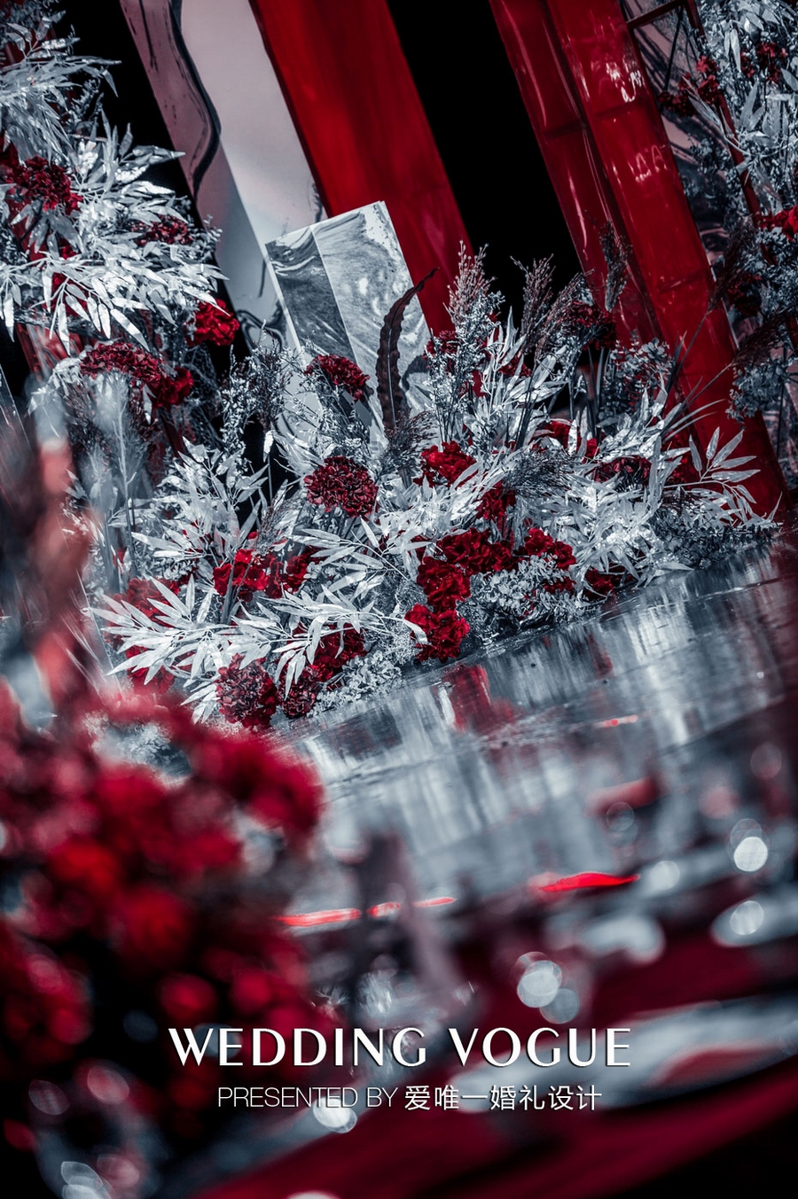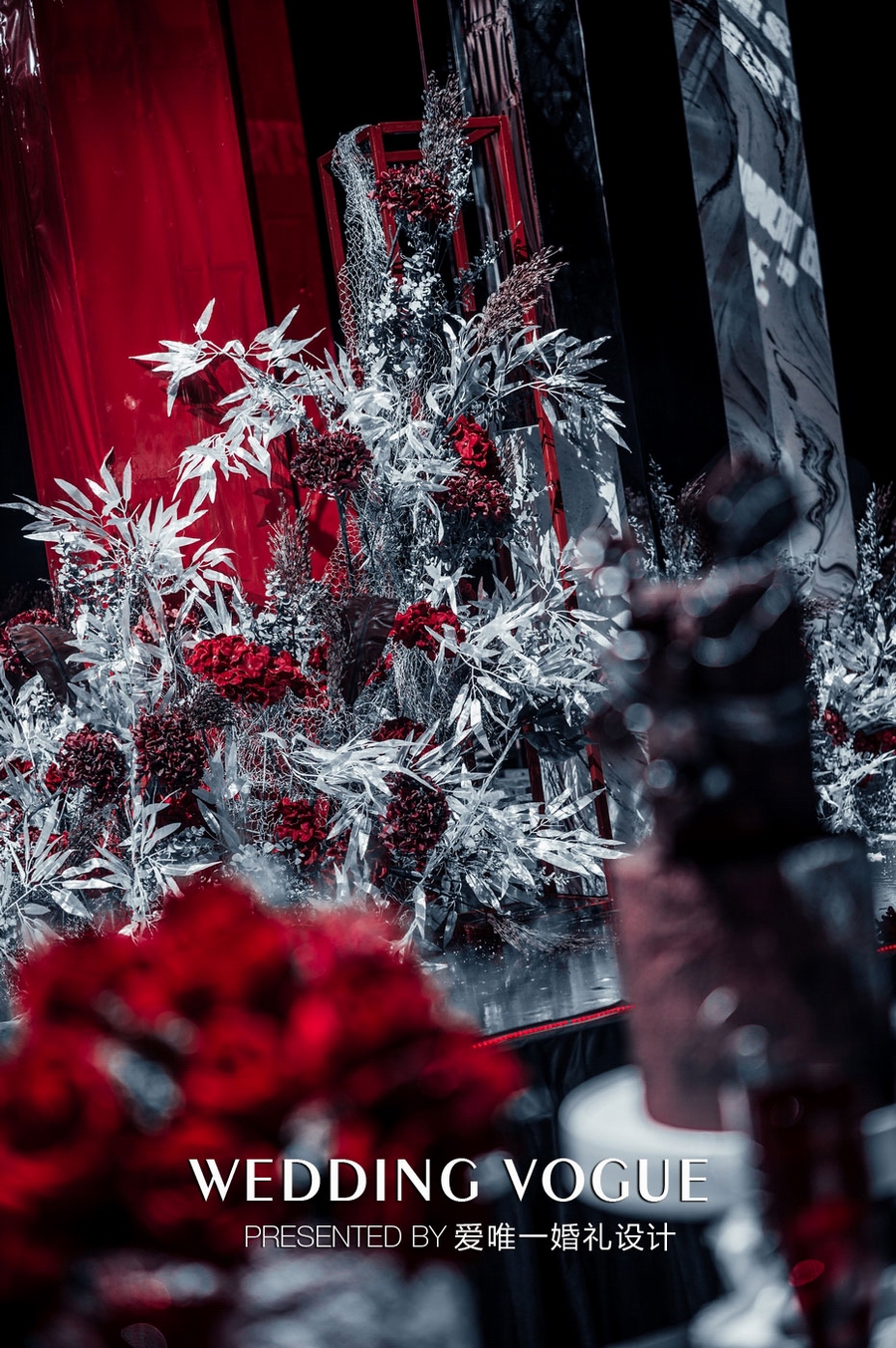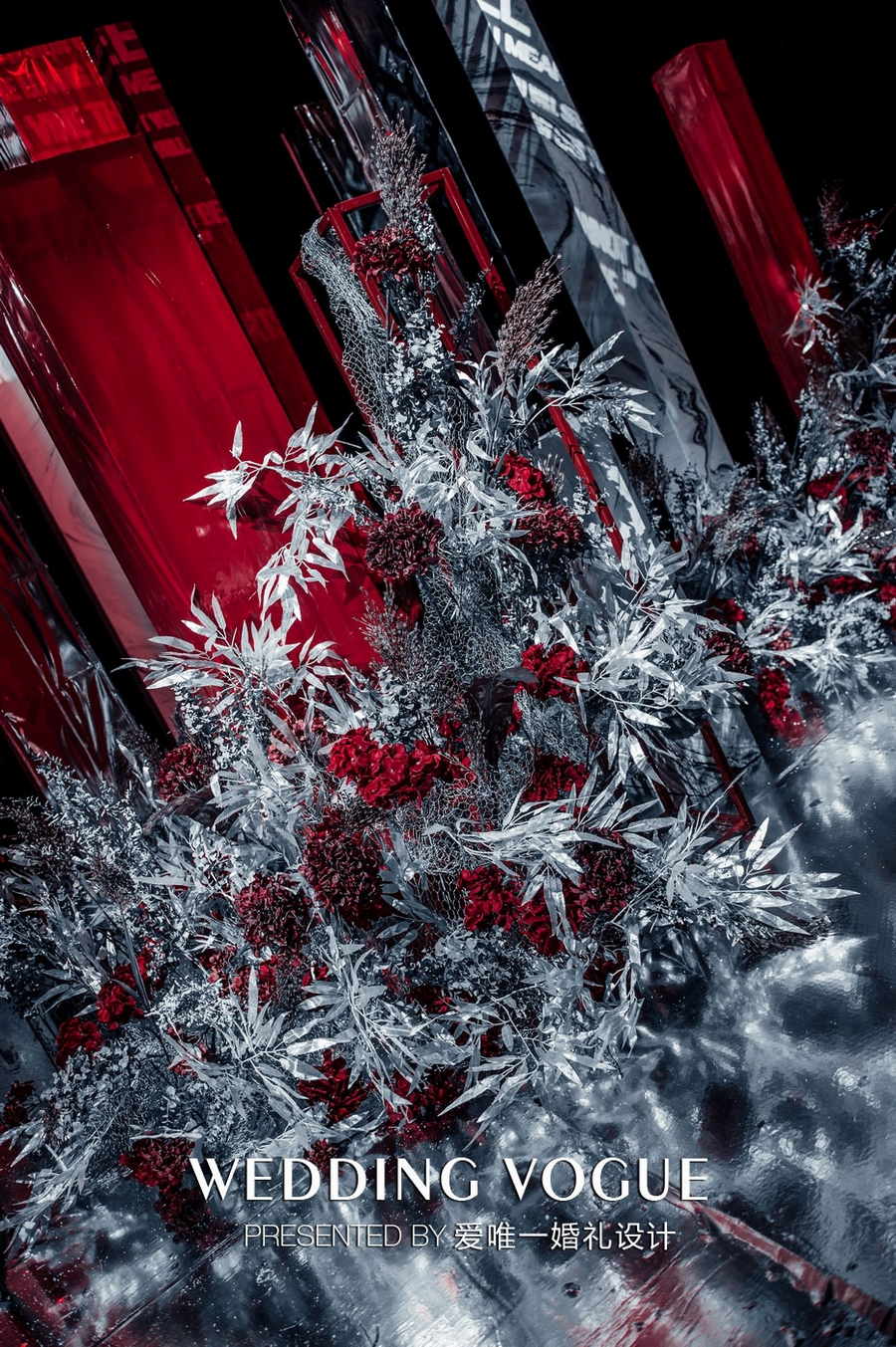 爱唯一婚礼设计在婚礼色调提炼上花费了不少心思,以玛瑙红与银色结合是他们慎重又无可挑剔的决定。