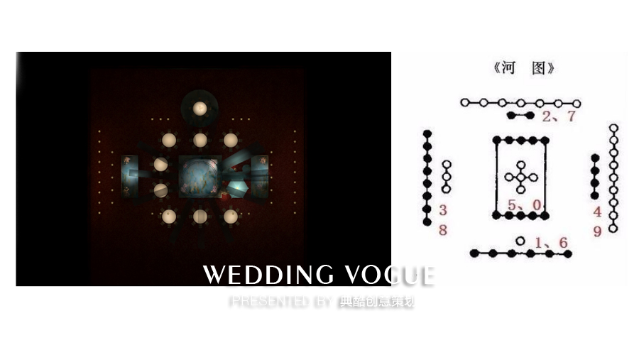 典酷结合新人对于数学的造诣,此次在场景设计中打破了常规的舞台格局设计,运用上古奇书《河图》、《洛书》的方位布局来为婚礼现场做整体布局。