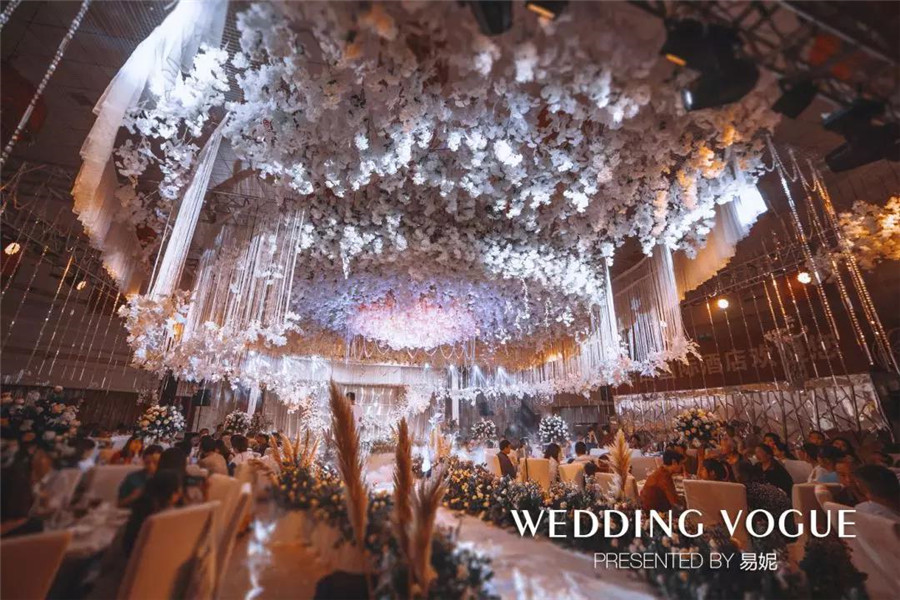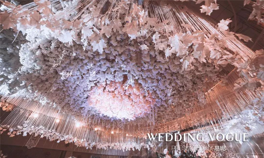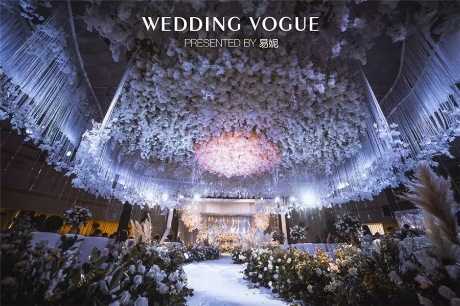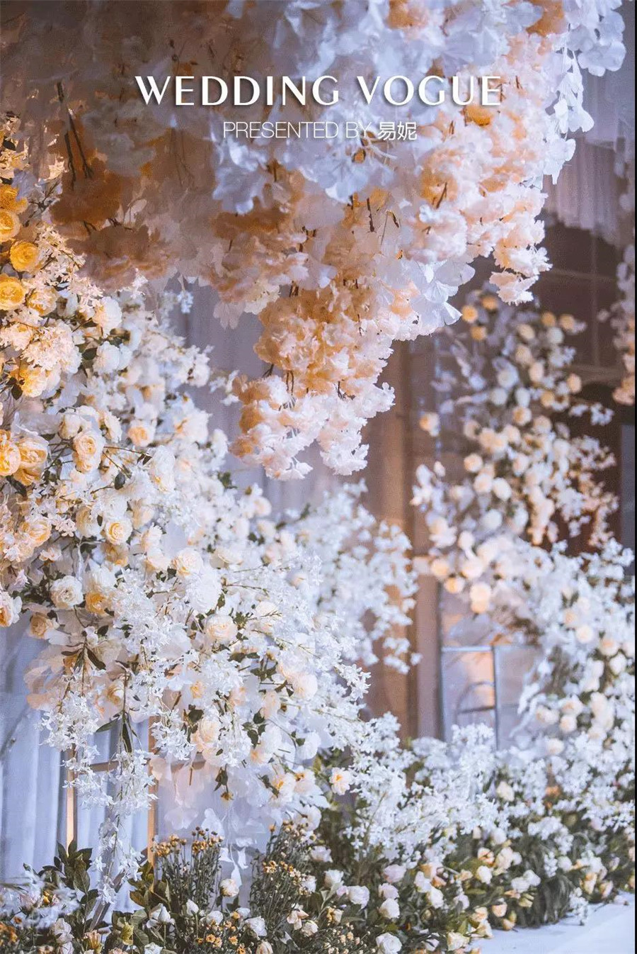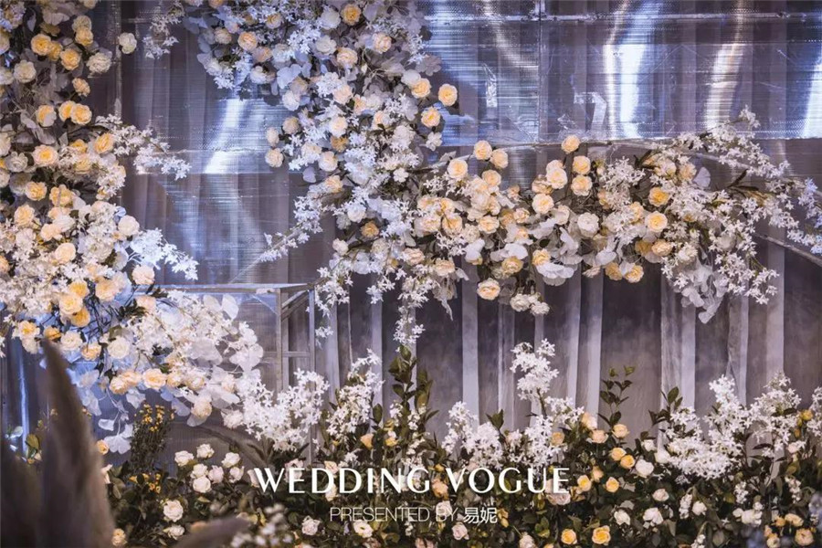 诺大的宴会厅中繁华似锦,以花瓣铺路,用花香做引,置身其中,好似能听到婉转莺啼,袅袅余音。这是设计师易妮匠心巧思的结果,也是新人十年恩爱的呈现。