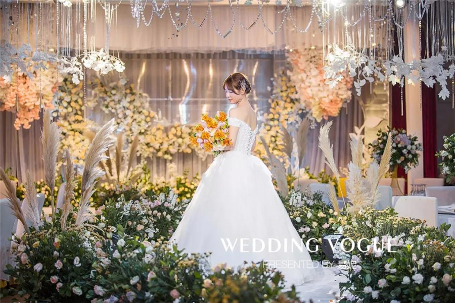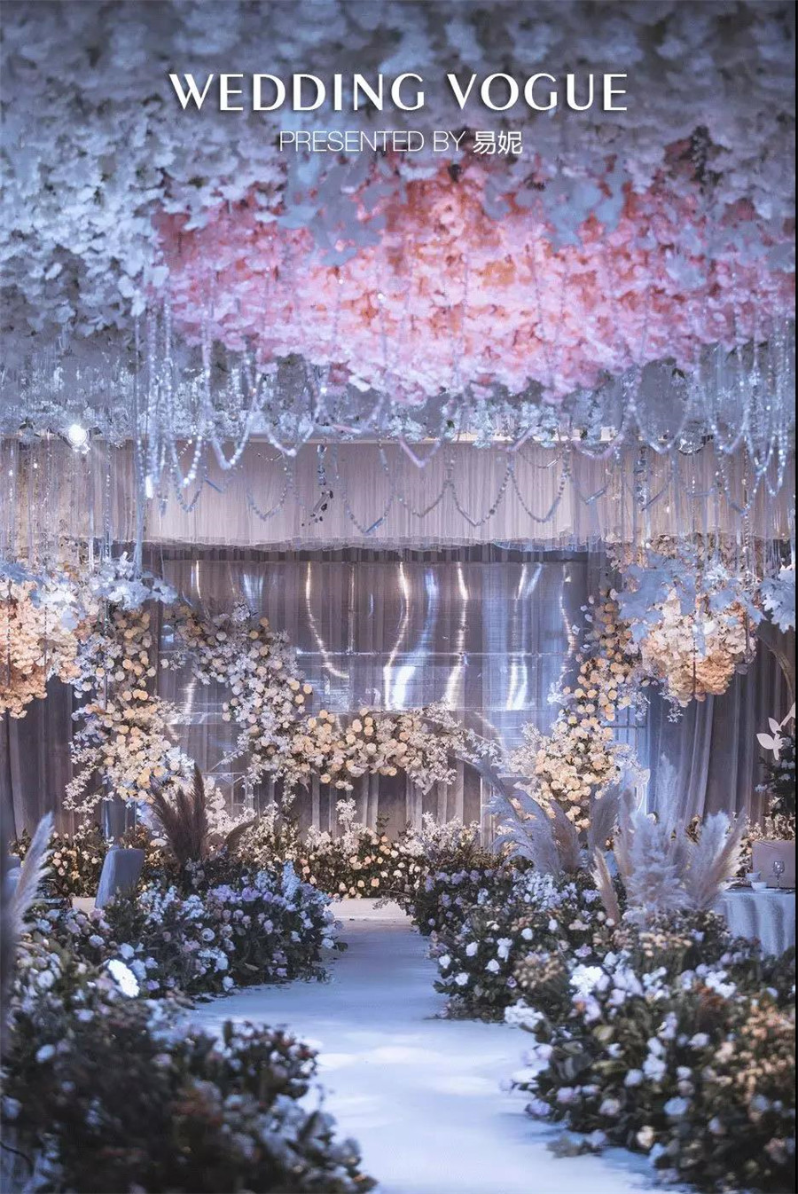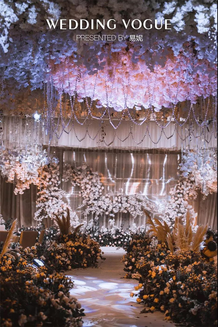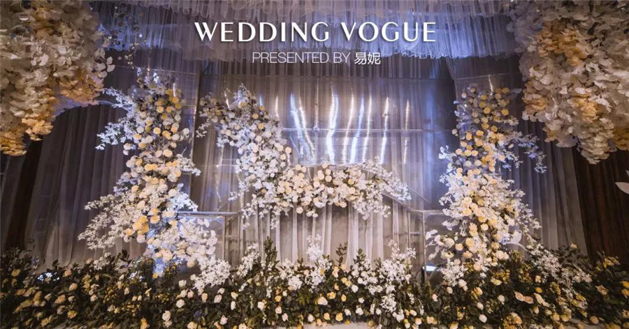 诺大的宴会厅中繁华似锦,以花瓣铺路,用花香做引,置身其中,好似能听到婉转莺啼,袅袅余音。这是设计师易妮匠心巧思的结果,也是新人十年恩爱的呈现。