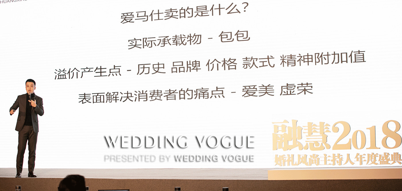 黄潇在此次的演讲过程中通过对比同样质量和作用的鸿星尔克品牌鞋和耐克品牌鞋的差异,来论述品牌,以及品牌背后给予产品的附加值。继而引申到婚礼行业中,探究合作价的存在原因,传达了婚礼主持人第一识别性的重要性。