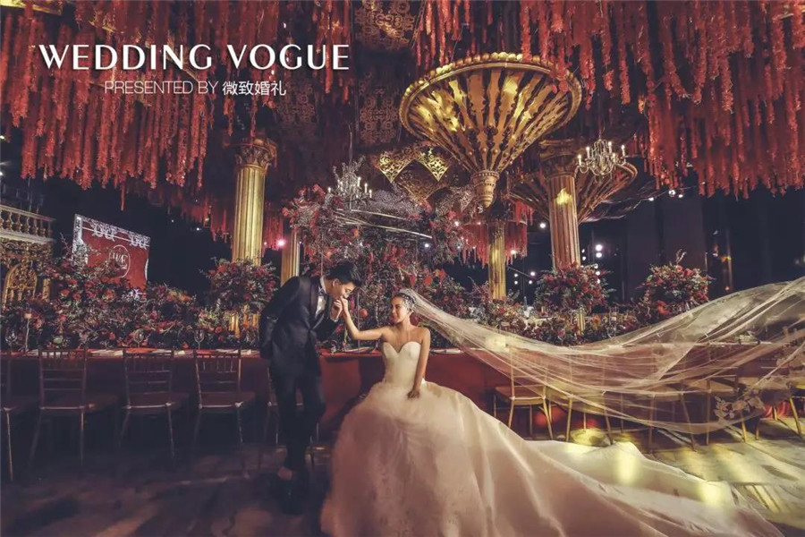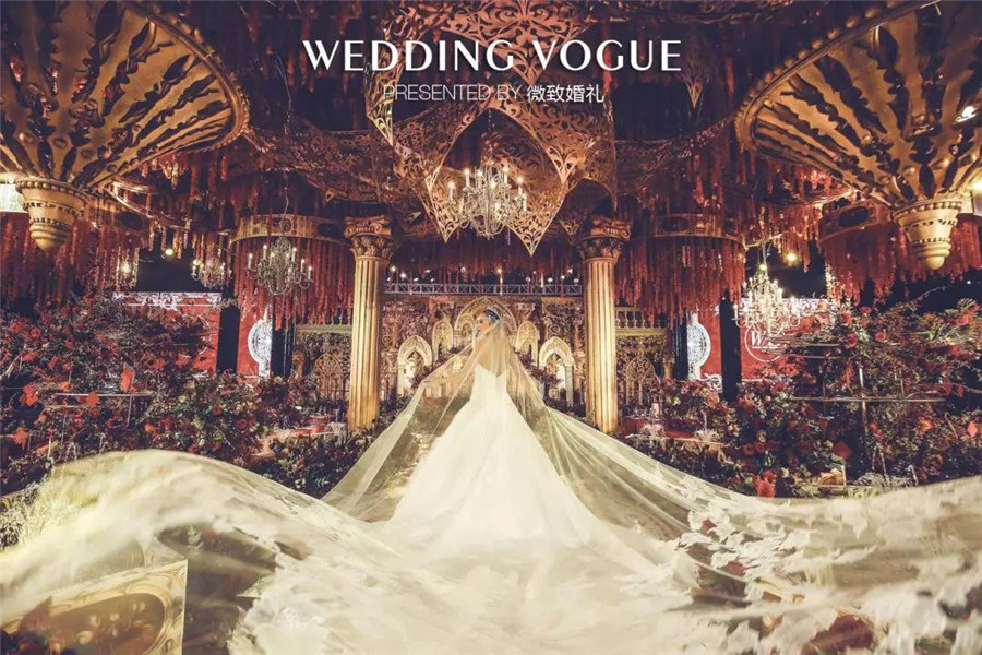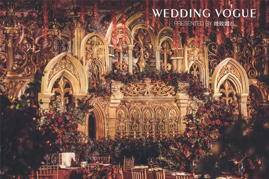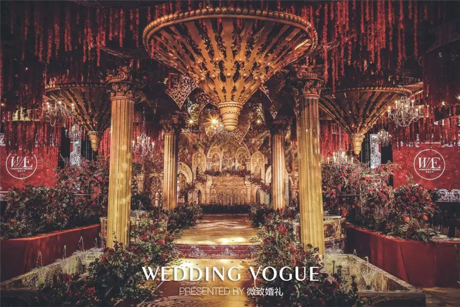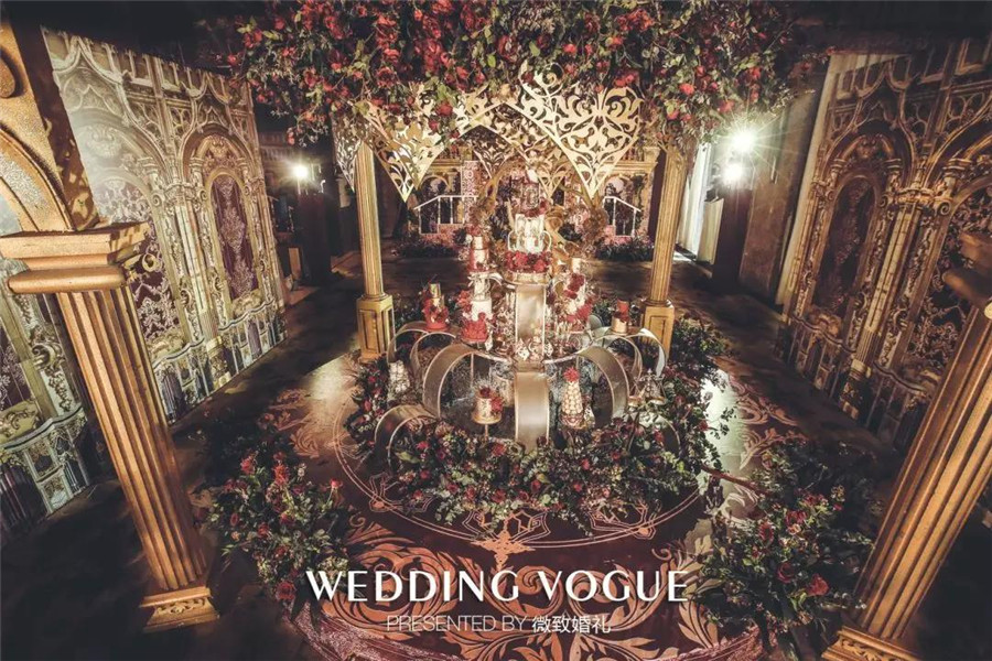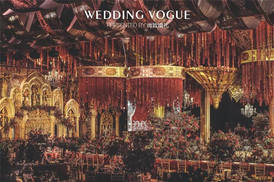 300万朵鲜花,宴会厅全部用金色水晶璎珞装饰,纱幔和灯光作为点缀,高雅之余不失少女的浪漫情怀。