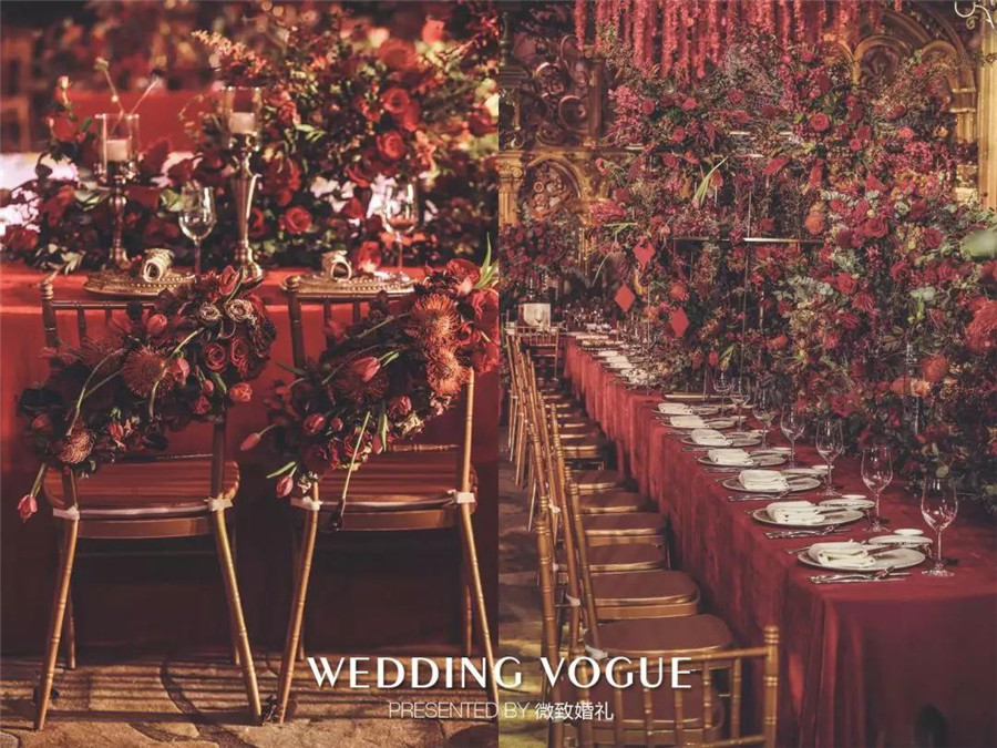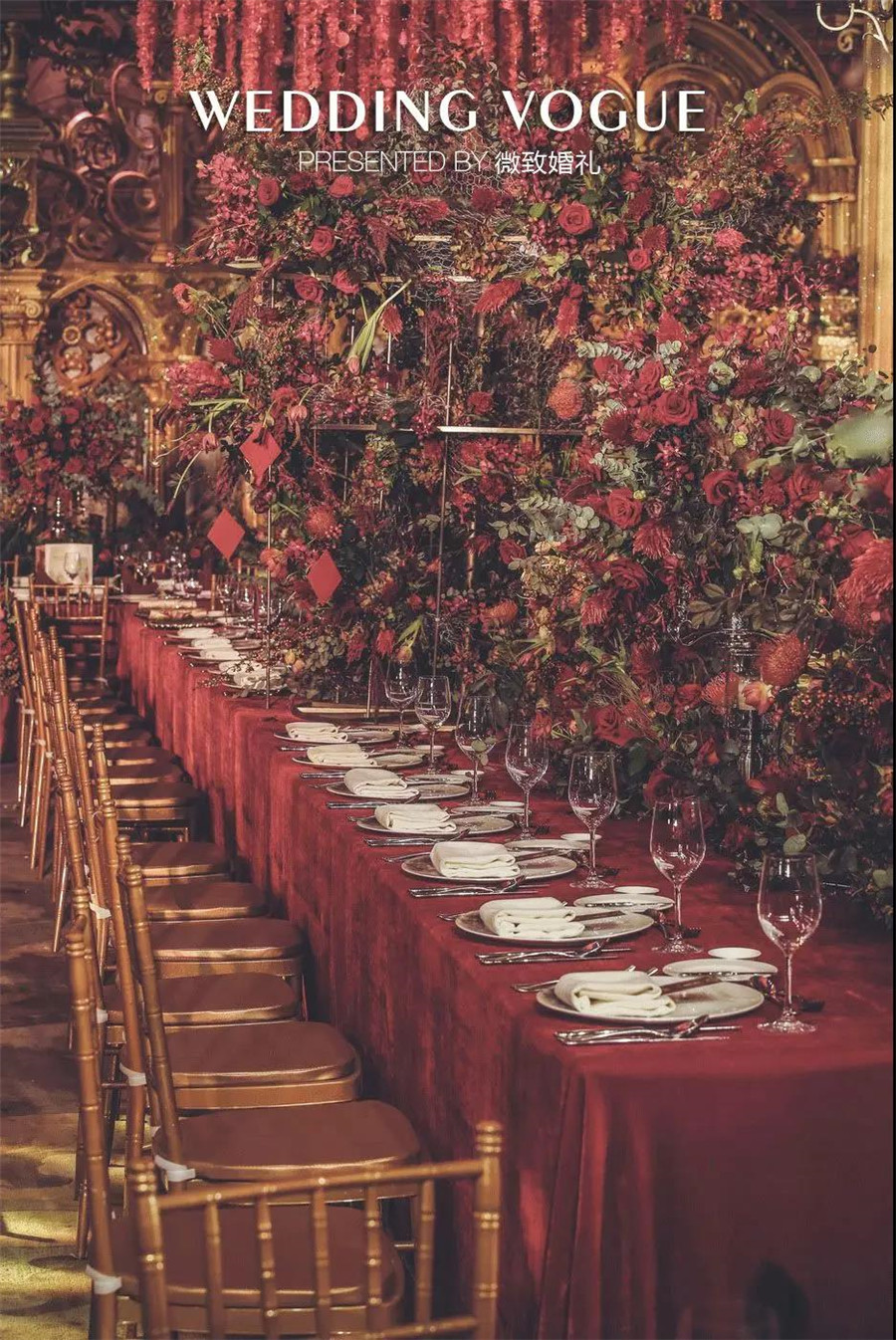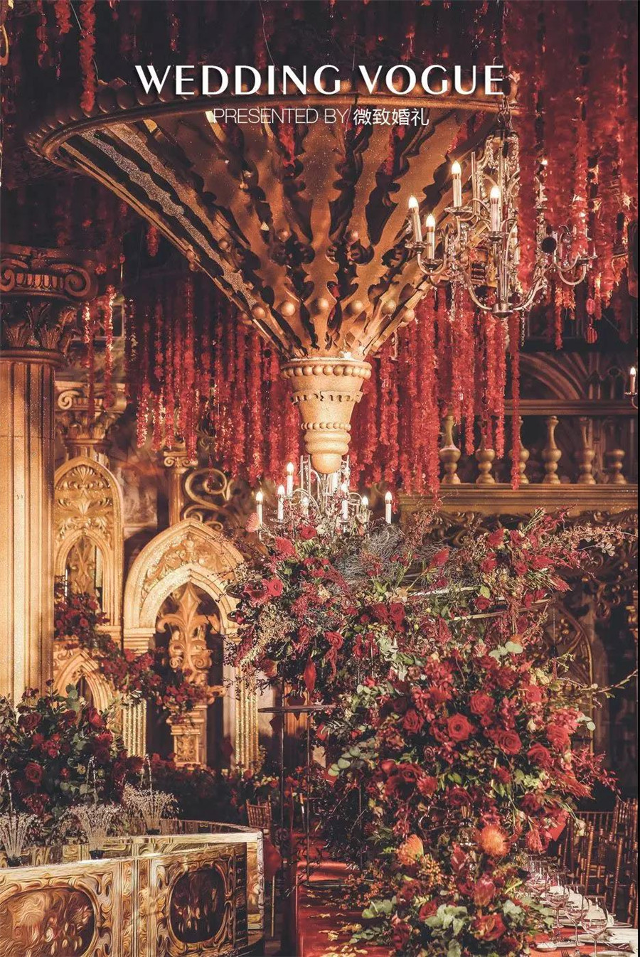 300万朵鲜花,宴会厅全部用金色水晶璎珞装饰,纱幔和灯光作为点缀,高雅之余不失少女的浪漫情怀。