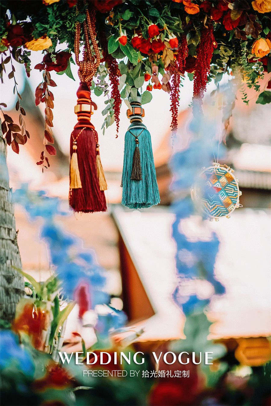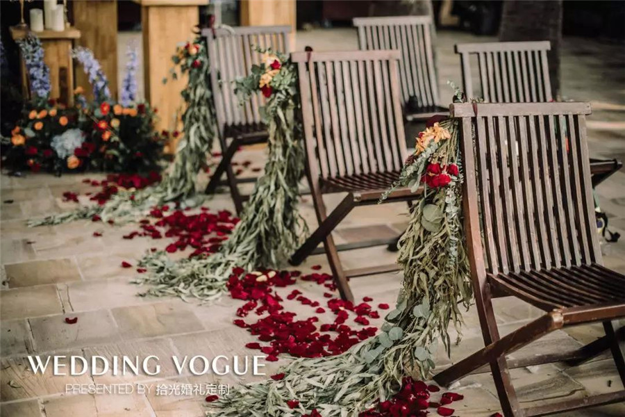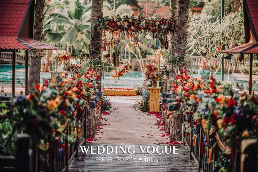 流苏连接木桩,花瓣铺满地面,新人于柬埔寨旅行之中相识相恋,如今回到他们最初相遇的地方举行婚礼,拾光觉得这是一份回忆的情结,所以做了一条长长的走廊,让新娘身披嫁纱,一步一步朝着她的新郎走去,庄严而又神圣。