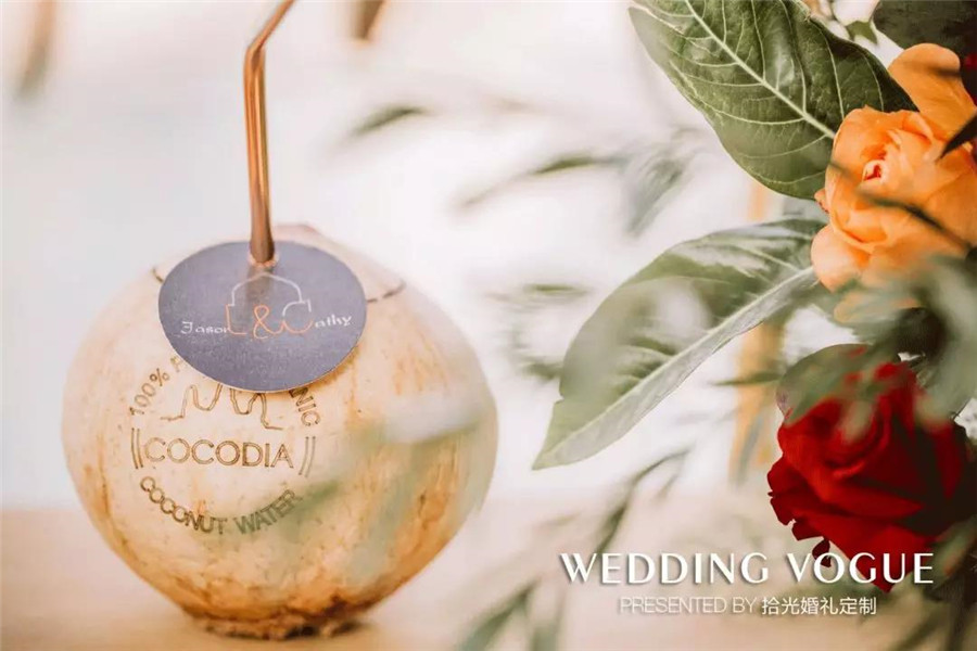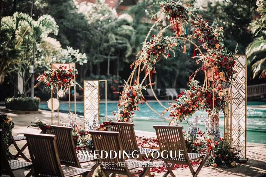 泳池的正中间是木质藤编搭建构成的合影区,两把藤椅与后面的泳池相得益彰,不仅是参加婚礼,更给来宾一种悠闲度假的感受。