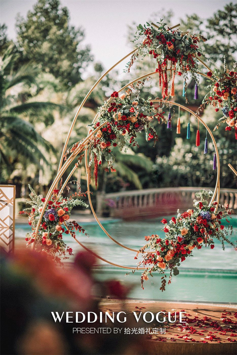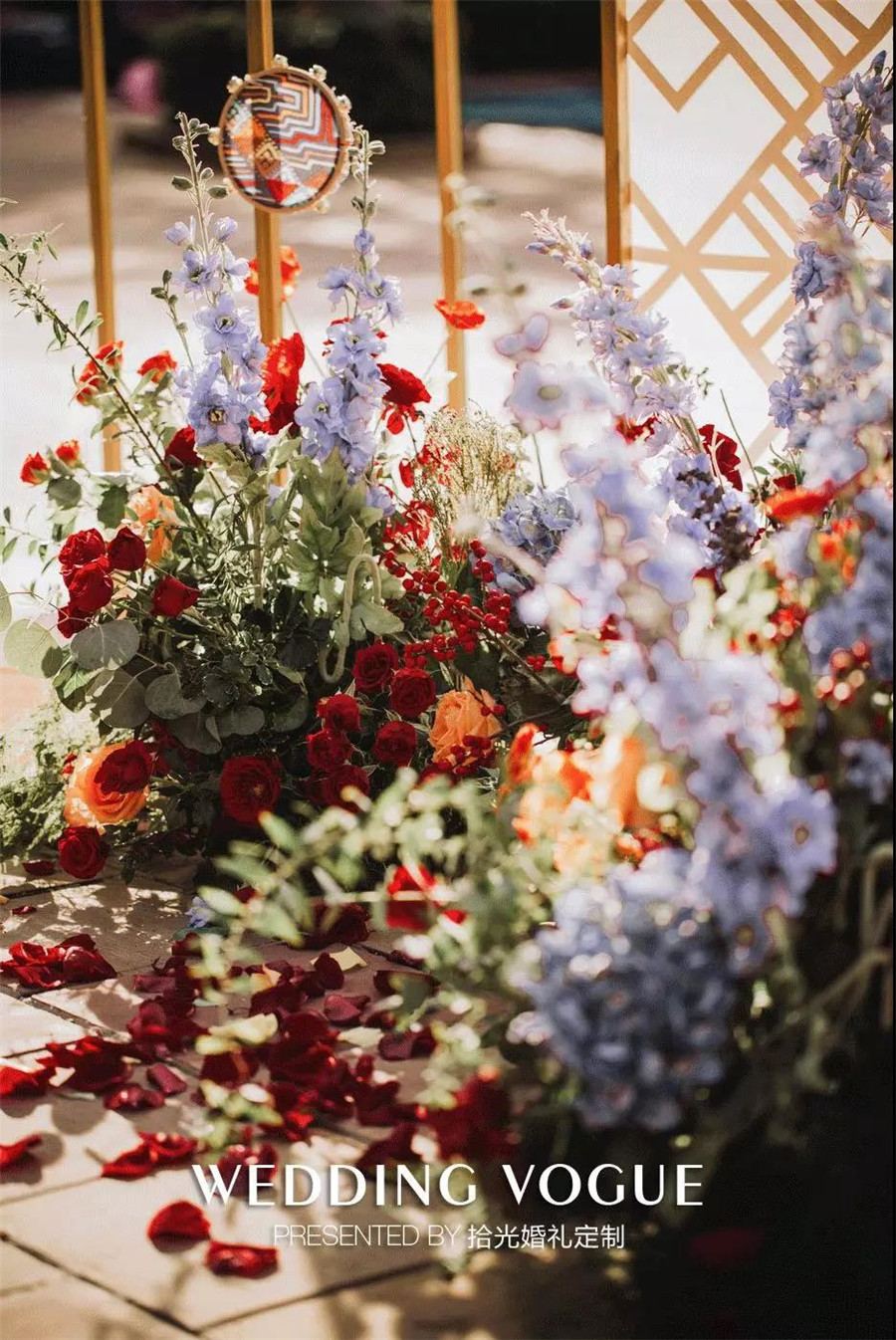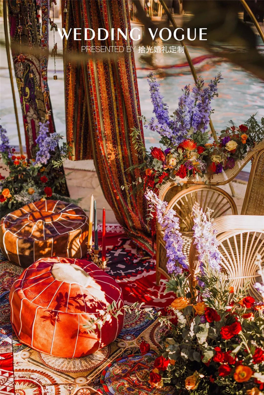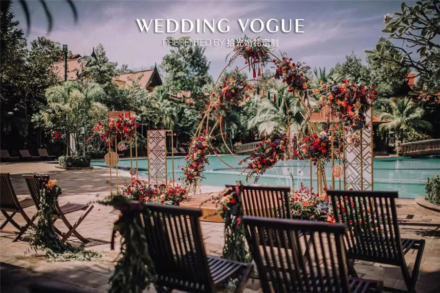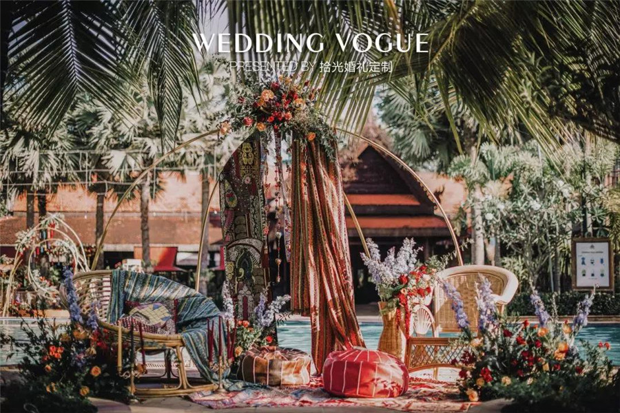 婚礼的举行地是酒店的泳池边,开阔静谧,浓郁的树木自带有东南亚的风情,所以拾光选用了孔雀蓝、橙色、紫色、酒红等高饱和度的撞色,来再现柬埔寨所呈现出的视觉冲击。
