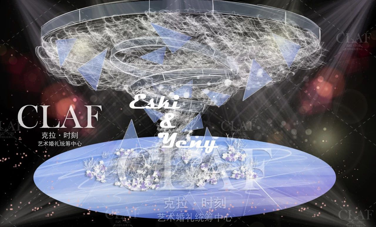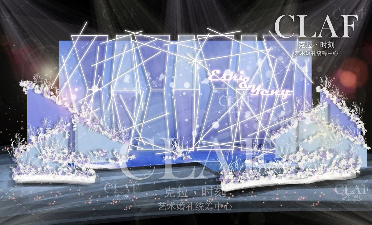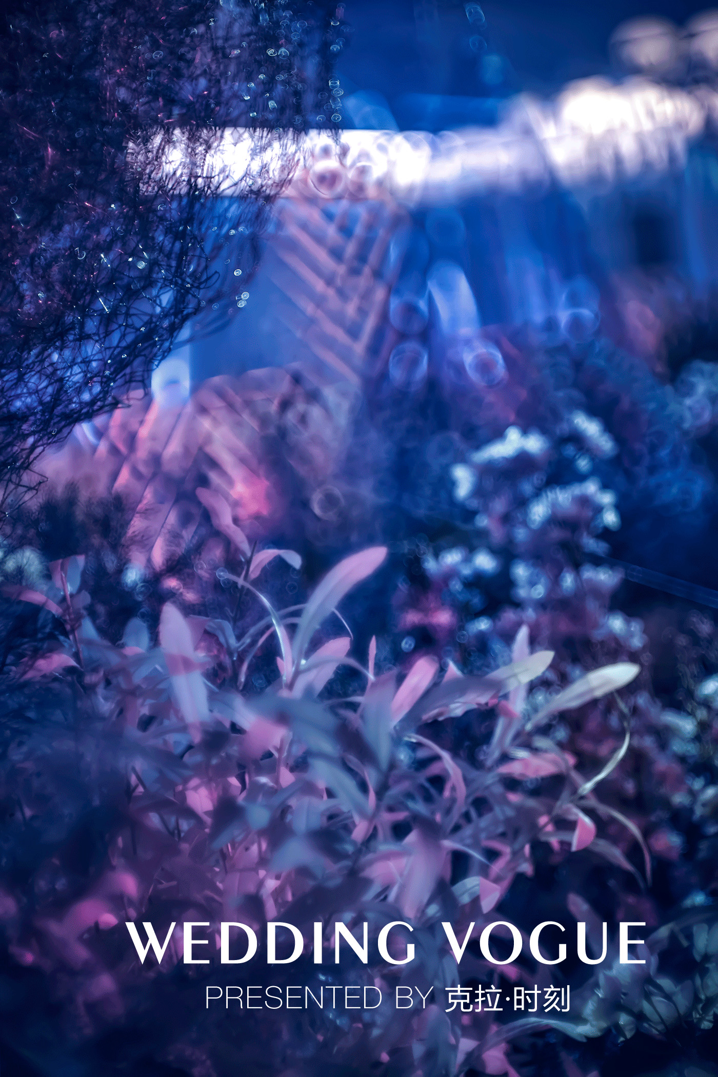 这一场“夜店趴”婚礼的设计大胆创新,整体婚礼色系采用冷基调但明亮的紫色与闪耀的银色装扮。并且充分利用了灯光资源,将原有的镂空风基础上加入了轻灵的元素,如梦中醒来般出现的瞬间幻影。
