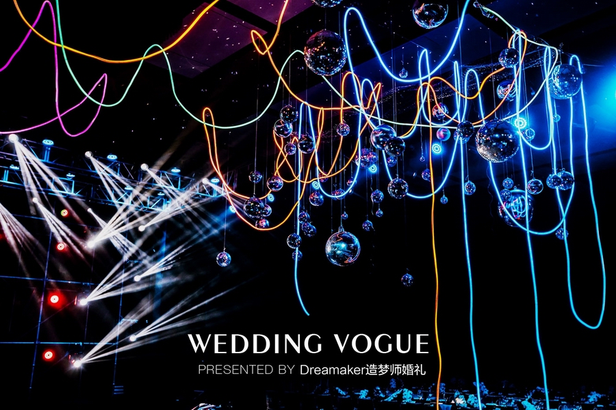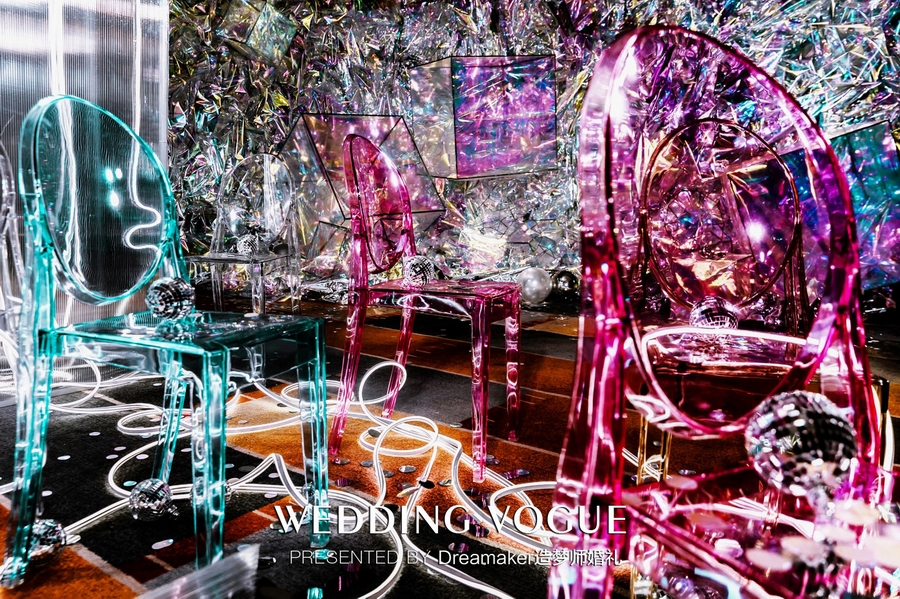 Dreamaker造梦师婚礼今年的创意布展采用了炫彩镭射的主视觉风格映衬主题,即使是邀请函及封套选用珠光纸,也自带BlingBling的亮闪闪效果。