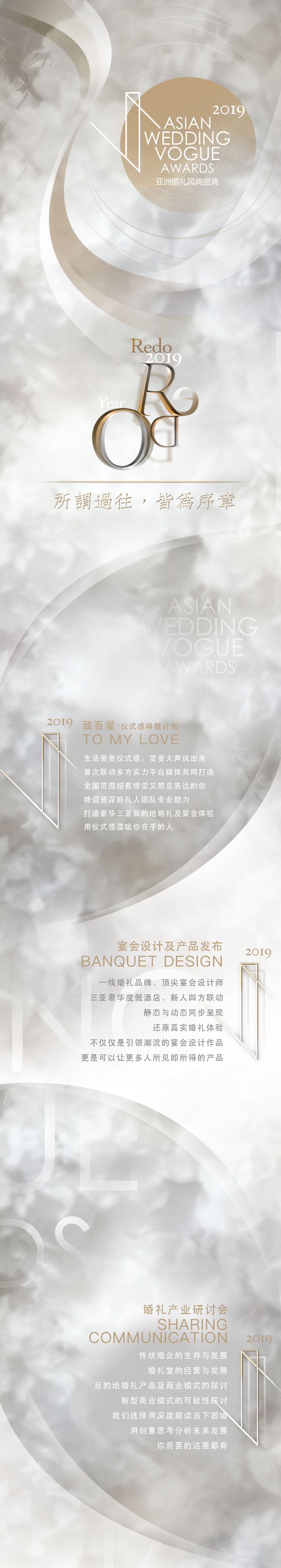 2019亚洲婚礼风尚盛典以Redo为活动主题。如果说,十年前婚礼风尚因为喜爱而开始,那十年后,婚礼风尚则将因为热爱而继续。