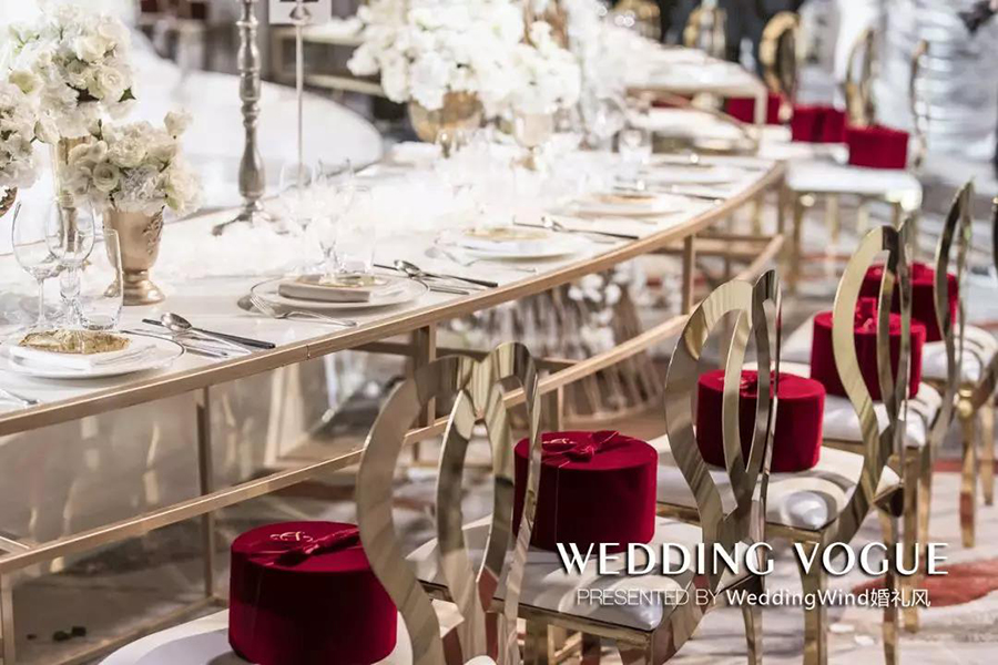 动态式的流线型餐桌设计是婚礼风为狭长的宴会厅做的特殊设计。消除前后来宾的距离感,让到场每一位都有参与感是他们设计的核心。