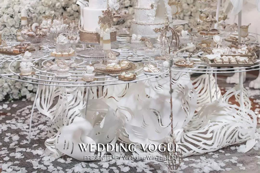 7个天堂场景的设计与餐桌的摆放形成契合。从新娘入场开始,所走的每一个场景都能与在场的来宾形成互动。