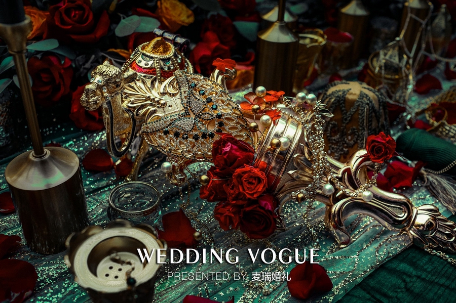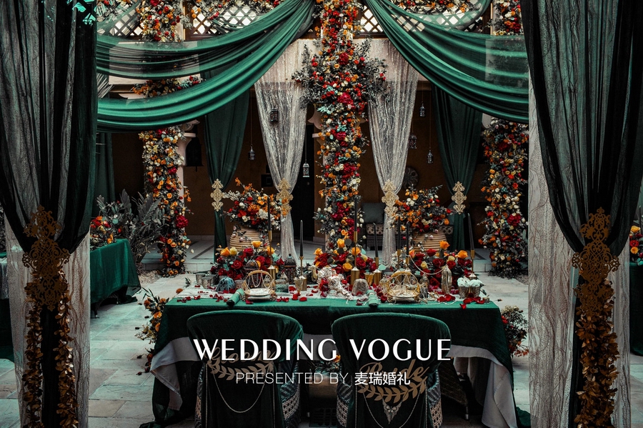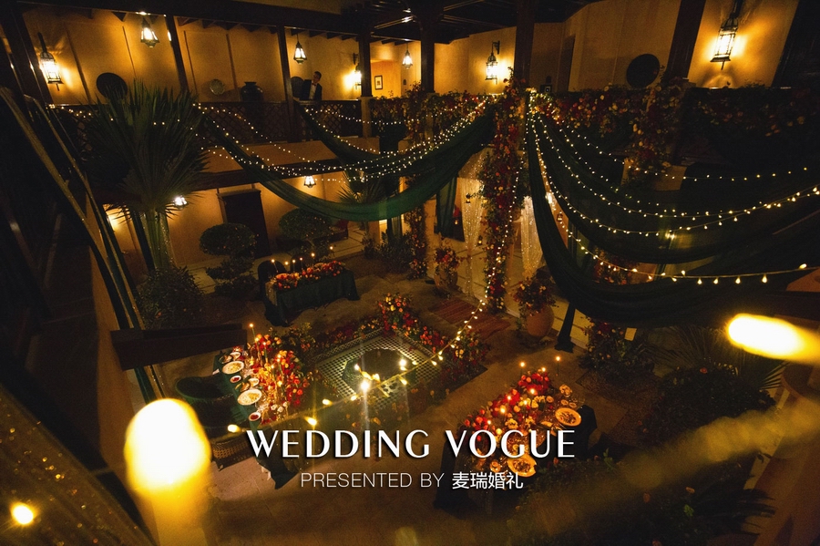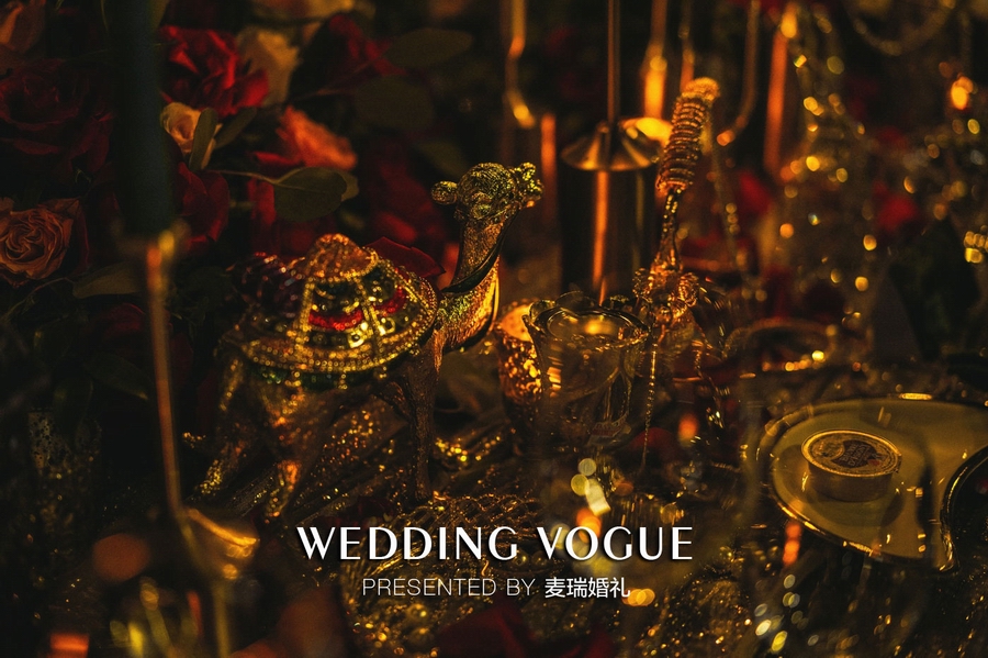 麦瑞的设计师说:“民族风格一定带有强烈的情感,色彩、造型和元素缺一不可,无论何种,都是结合和运用的完美呈现。”在这场婚礼中,迪拜的奢华和东方的细腻在包容下相得益彰,在设计中用更多的重墨华彩来强调每一个细节。