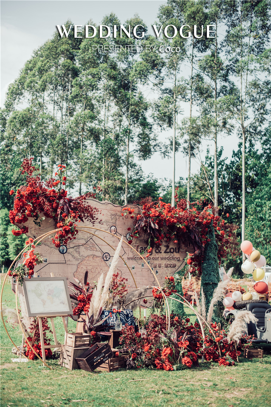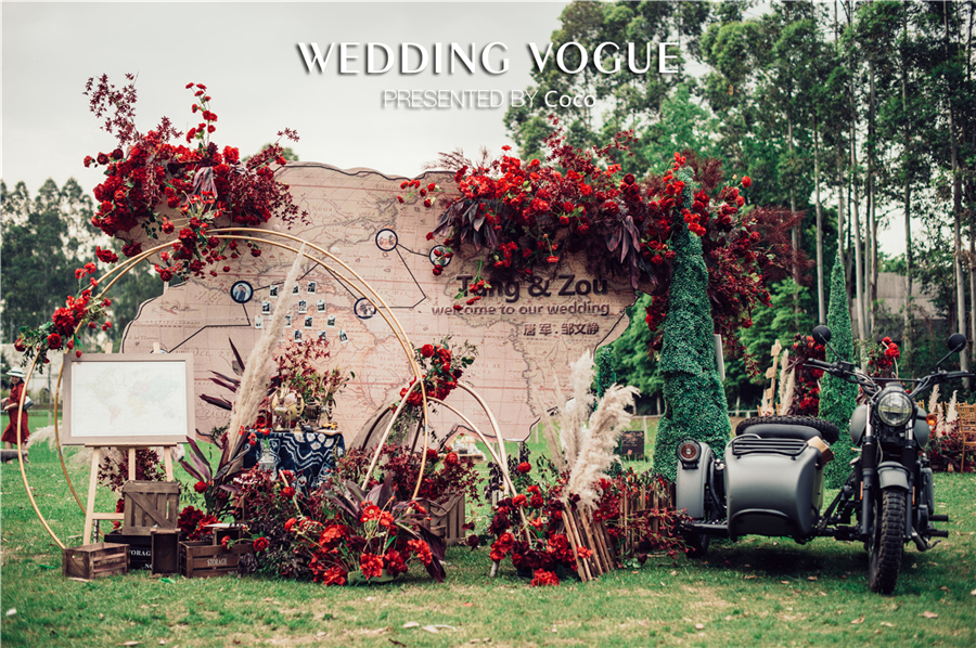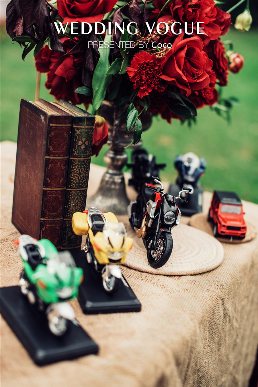值得一提的是,这场草坪婚礼的用心之处在于复古的设计融合到了现场的每一个角落。从签台、照相区域、婚礼主题的背景、摆件,甚至小到拍立得的图钉都融合了新人最爱的摩旅元素。整体的呈现让新人在婚礼当天勾起了许多美好的回忆,也让来宾感受到了新人因为爱好相结合的不易以及对爱好的执着。