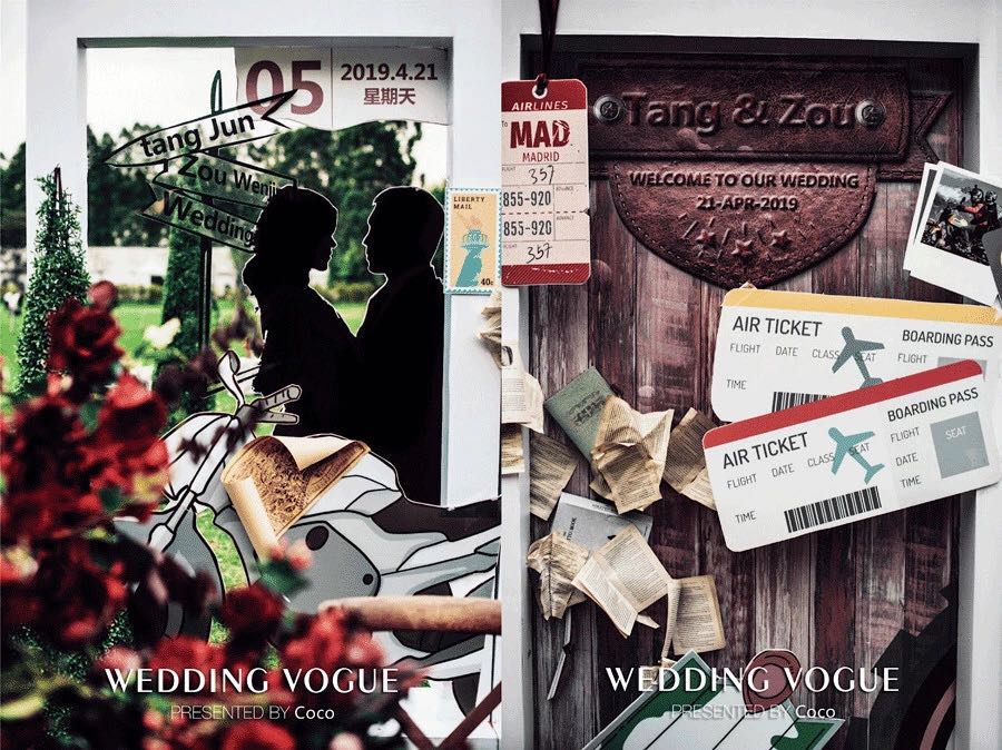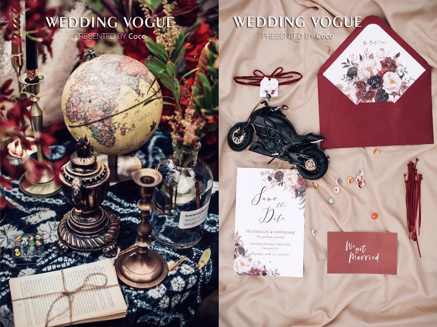 从签台、照相区域、婚礼主题的背景、摆件,甚至小到拍立得的图钉都融合了新人最爱的摩旅元素。整体的呈现让新人在婚礼当天勾起了许多美好的回忆,也让来宾感受到了新人因为爱好相结合的不易以及对爱好的执着。