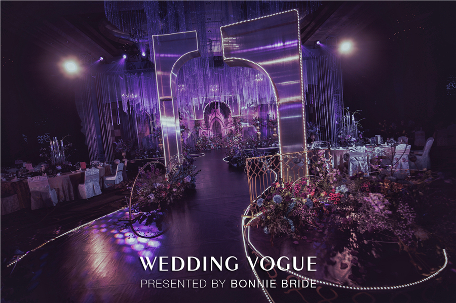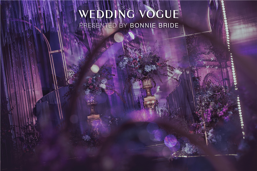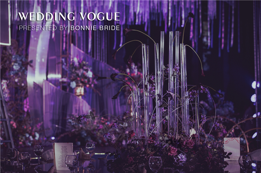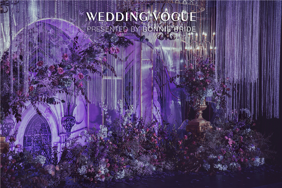 关于婚礼设计,新娘表示很喜欢紫色和浪漫的感觉,并且希望能呈现出比较深邃且梦幻的效果,因此设计师便将这场婚礼设计成一座“紫色的空中庄园”。