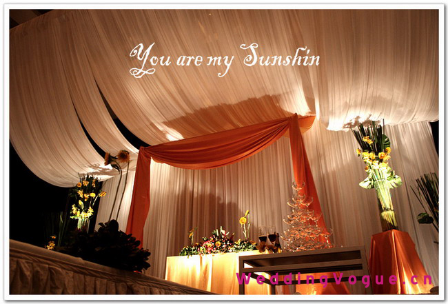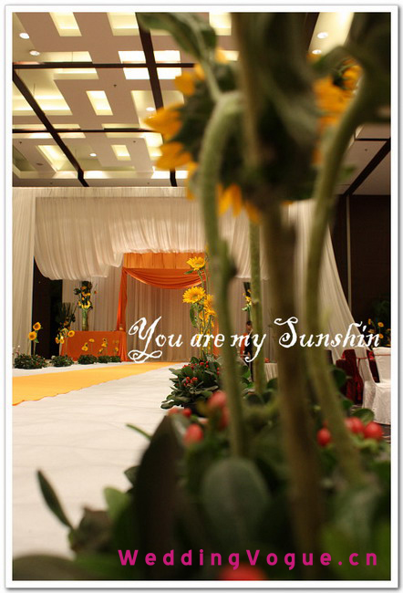 首先是舞台部分,橘色的布艺与向日葵非常搭配同时还区别于大众化的单面背景。舞台被布置的很立体