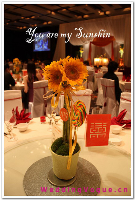 宾客的桌子上很简洁的向日葵花束还有一只开爱的大棒棒糖~