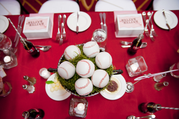 餐桌上的装饰品里都放了满满的棒球,就如同新人心中满满的爱一般